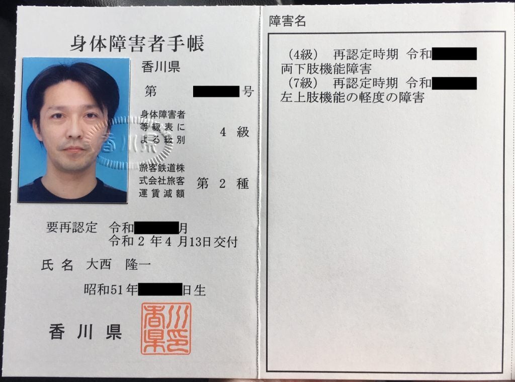 ※本当に障害を負ってしまった事を証明する為に障害者手帳を掲示させて頂きます。偽造防止の為、部分的に暗転しています。