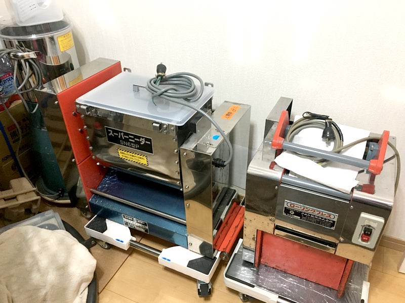 うどん店開業に必要な手打ち麺を作る機械はすでに買い揃えています。写真には写していませんが麺を延して切る手打ち式製麺機もあります。