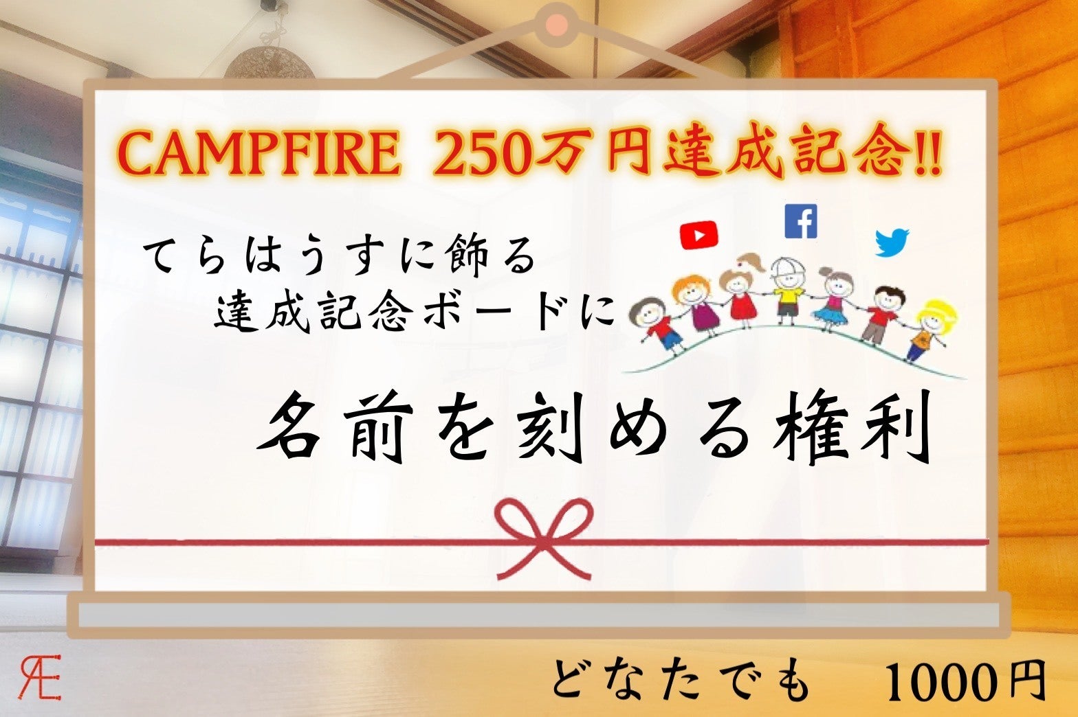 代表の川﨑です!おかげさまで250万を達成し、本日リターンを追加させていただきました!そのリターンがこちら!【CAMPFIRE達成記念!記念ボードに名前を刻めます!】▼詳細CAMPFIRE250万達成記念!CAMPFIRE250万達成記念としててらはうすに達成記念ボードを置く事にしました!この達成の喜びを皆さんと分かち合い、未来永劫残る形にしていきたいと思ったからです。そこで記念ボードに名前を刻むことができるリターンを緊急追加しました。お名前(本名でもニックネームでもOK)と、任意でSNS情報(QRコード化します)も載せられます。ひとつのボードを通じて、CAMPFIRE支援者のご縁を繋いでいきます!てらはうすが存続していく限りこのボードは大切に保管しますので、てらはうすに訪れた時に見ることができます!また、このCAMPFIREを通じて京都以外の方ともたくさんのご縁が繋がりました。ぜひこのボードにお名前を刻んでいただき、それを見にてらはうすへ遊びに来ていただけると嬉しいです!てらはうすに"CAMPFIRE支援者"として名前を刻める最初で最後のチャンスです!すでに支援してくださってる方にも、まだの方にも多くの方に選んでいただきたいため無理ない金額で設定させていただきました!多くの方の名前をボードに刻みたいため是非ご支援のご検討の程よろしくお願い致します!