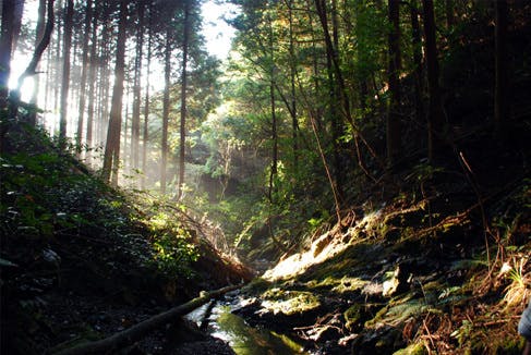 足久保川を中心に左右が山に覆われており、東向きの茶畑は朝陽が当たり、西向きの茶畑は夕陽に当たるようになっています。山深く、1日の日照時間が平地と比べて短いこと、昼夜の寒暖差が激しいこと、また、朝霧が立ち込めやすくそれが天然の遮光となり、直射日光を遮られることでお茶にとって程よい湿度がもたらされるおかげで、この土地では昔から自然と、香りと甘みの強いお茶が育ち、おいしいお茶ができる土地として栄えてきました。