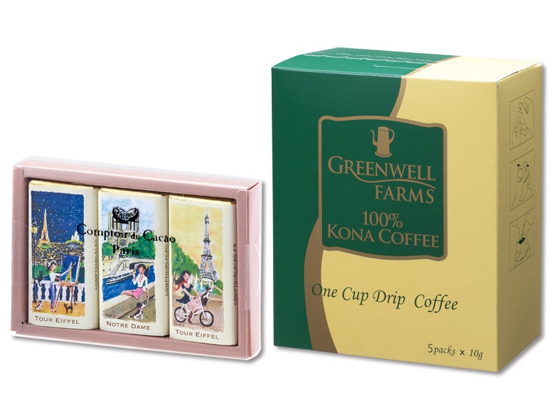 ハワイを代表する〈グリーンウェルファーム〉の100%コナコーヒーと、フランスのチョコの祭典「サロン・ド・ショコラ」でプラリネ部門1位を受賞したこともある人気チョコレート工房”コントワール・ドュ・カカオ”のチョコレートをセットにしてお届けします。