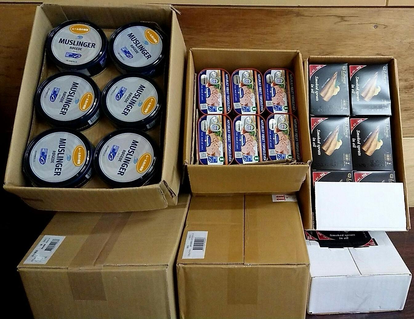 画像が本日、春日部にある当社物流センターに届いた商品。海外のグルメ缶詰3種類です。