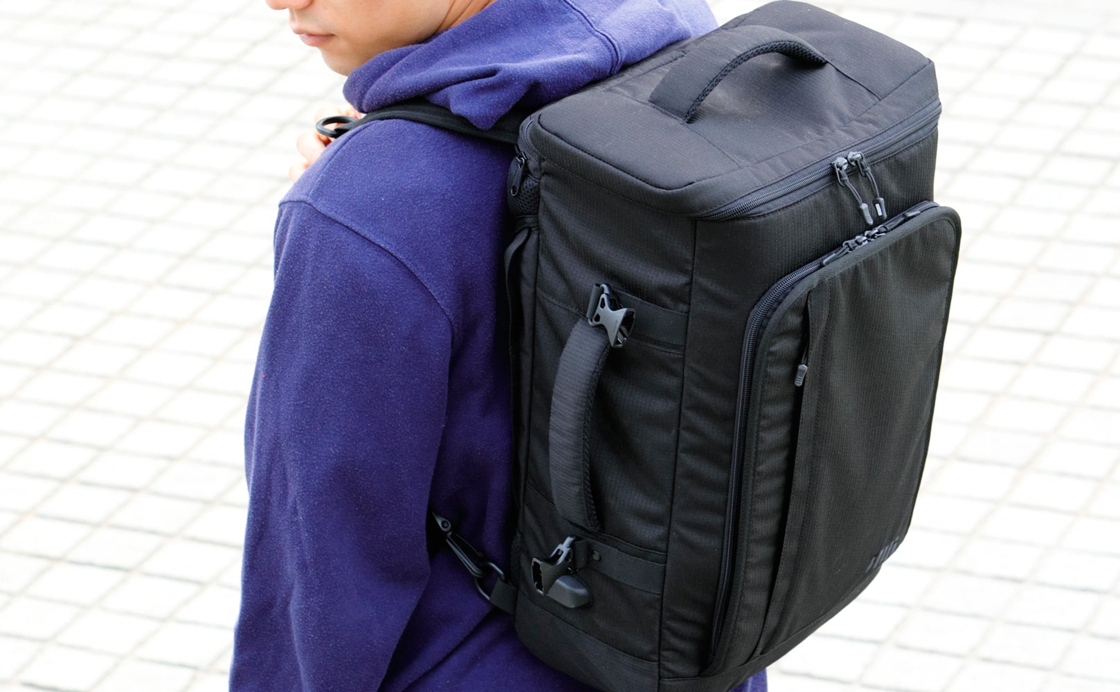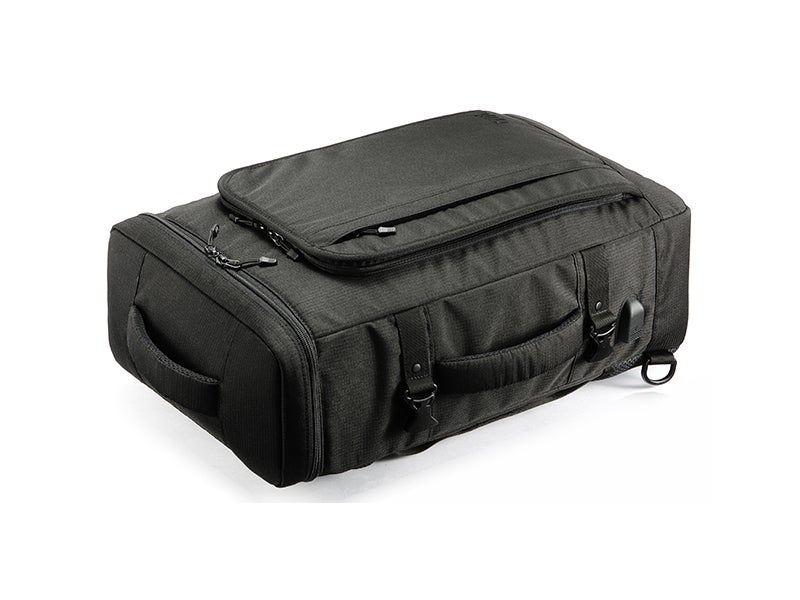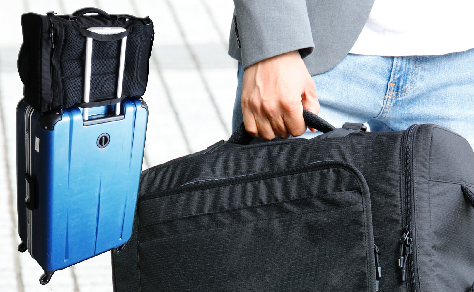 手提げバッグとして使える横持ち用ハンドルを装備し、ビジネススタイルにもフィットします。またキャリーオンストラップを装備しているので、スーツケースを伴う出張にも有効です。さらには飛行機内持ち込みOKの条件を満たすサイズ(三辺合計115cm以内)設計で国内線、国際線でもご利用いただけます。