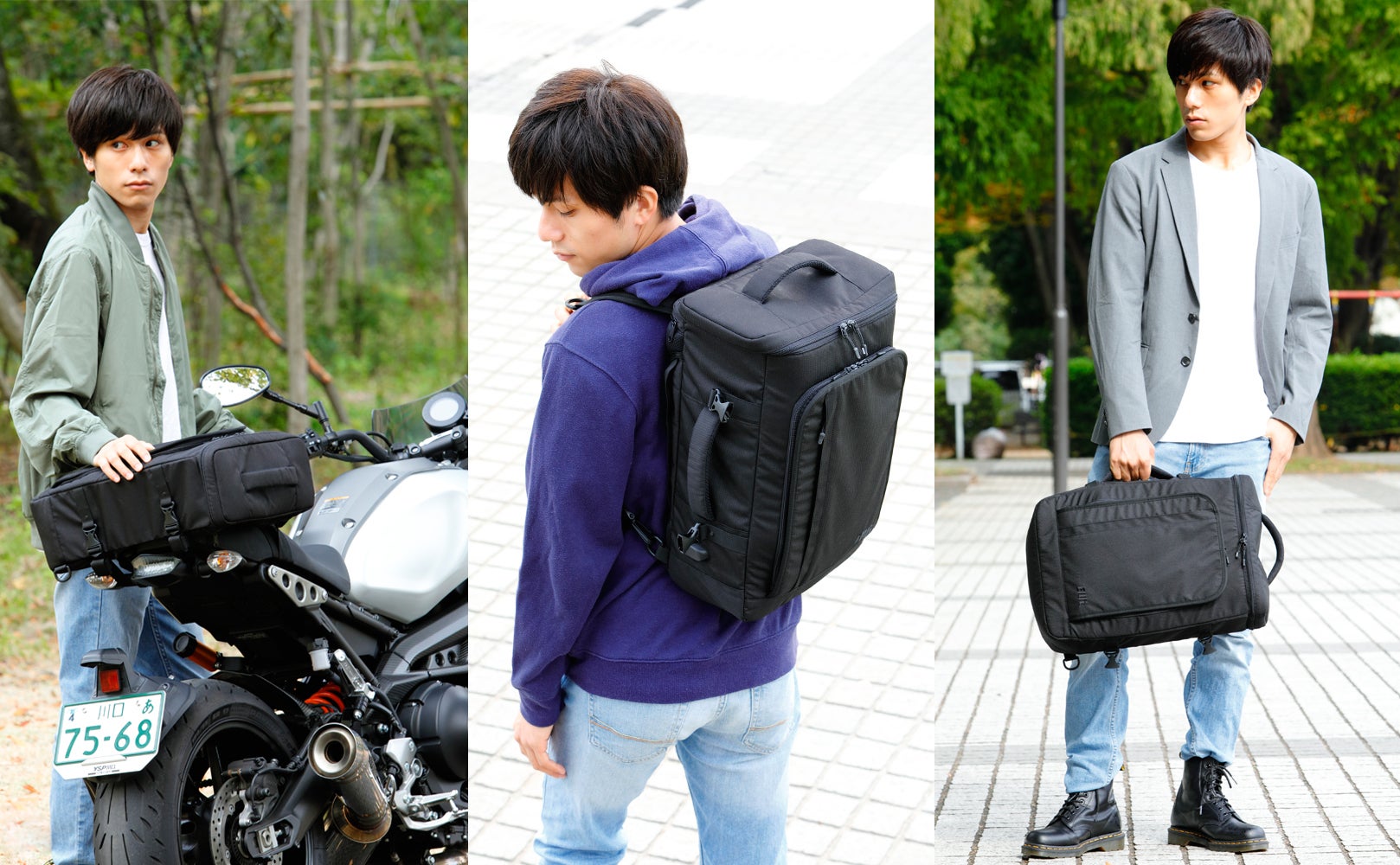 バイクに装着して【シートバッグ】として、ショルダーベルトを引き出せば【バッグパック 】として、そして横持ちハンドルで【ビジネスバッグ】としてご利用いただけます。