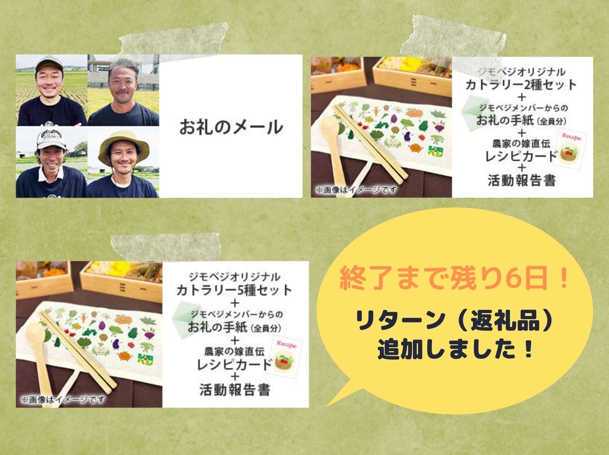 クラウドファンディング終了まで残り6日となりました。目標金額に対して現在の達成率は6%と、まだまだ達成に手が届かない状態です…!すこしでもご支援してくださる方を増やせるように、リターン品を追加いたしました!■【追加したリターン】 ①お礼のメール(500円)⇒ワンコインで手軽に支援いただけるリターンを追加しました!②ジモベジオリジナル カトラリーセット2種(3,000円)③ジモベジオリジナル カトラリーセット5種(5,000円)⇒ジモベジオリジナルデザインのカトラリーセットを追加!2種はおはしとフォーク、5種はお箸・フォークに加えて、フォーク、ストロー、ストローブラシがセットになっています。ふだんのランチタイムはもちろん、アウトドアでもご利用いただける便利でかわいいアイテムです\(^o^)/追加した3品以外にも、野菜セットや農業体験、お食事会やオリジナルグッズなど、ジモベジメンバーが一丸となって考えたリターン品をそろえています!終了まであと6日ありますので、すこしでも気になる方はぜひご確認いただければ嬉しいです。引き続きの応援、ご支援のほど、何卒よろしくお願いいたしますm(__)m