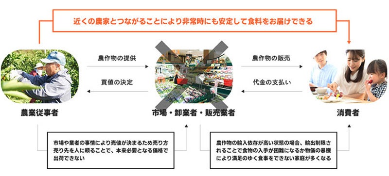 消費者と生産者が直接取引し『地元野菜が地元で流通する』仕組みを実現します。