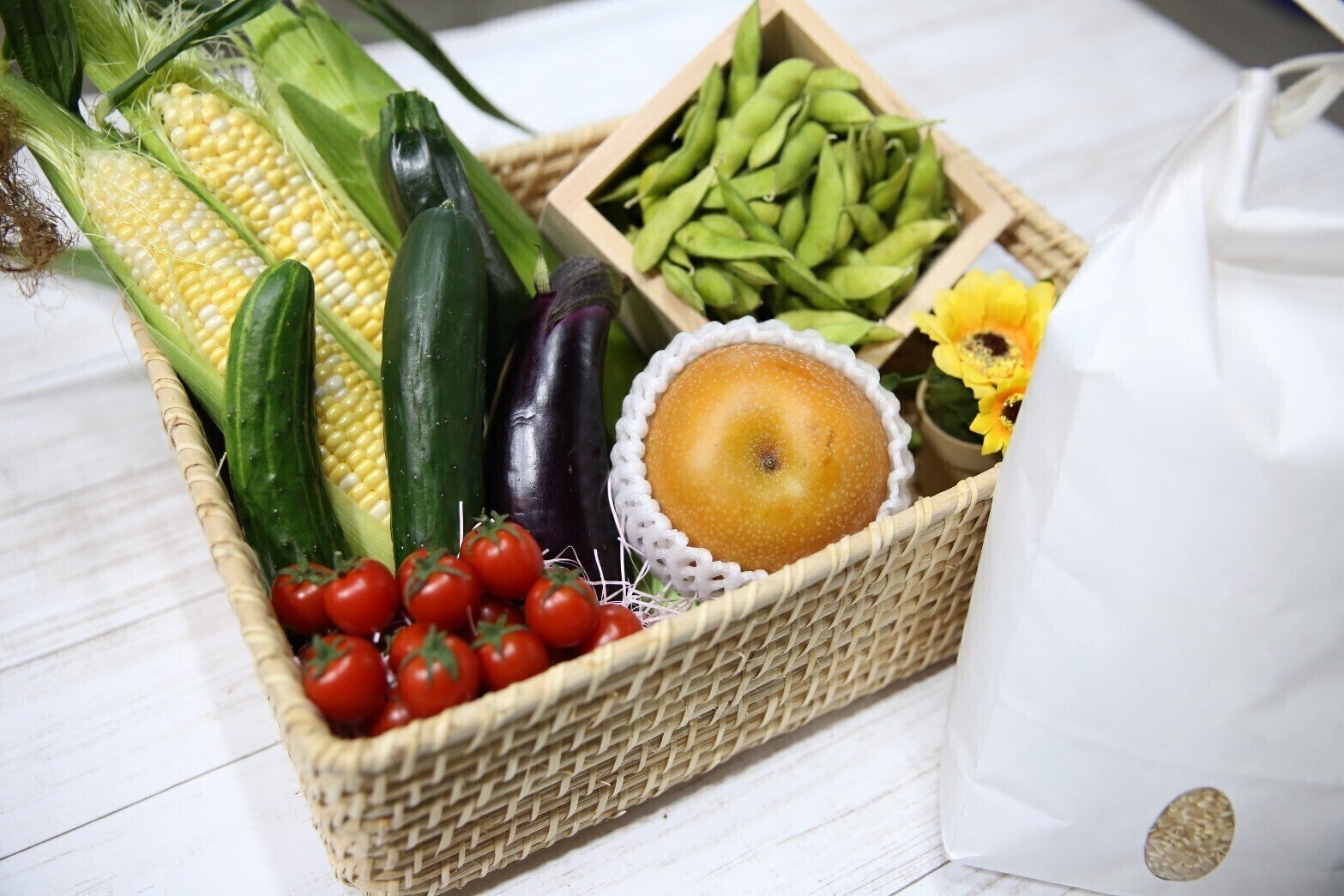 枝豆、とうもろこし、きゅうり、ミニトマト、梨、米、ナス、ズッキーニ、小玉スイカ、オクラ、ししとう、ネギの中から、7品目以上を詰め合わせてお届けいたします。
