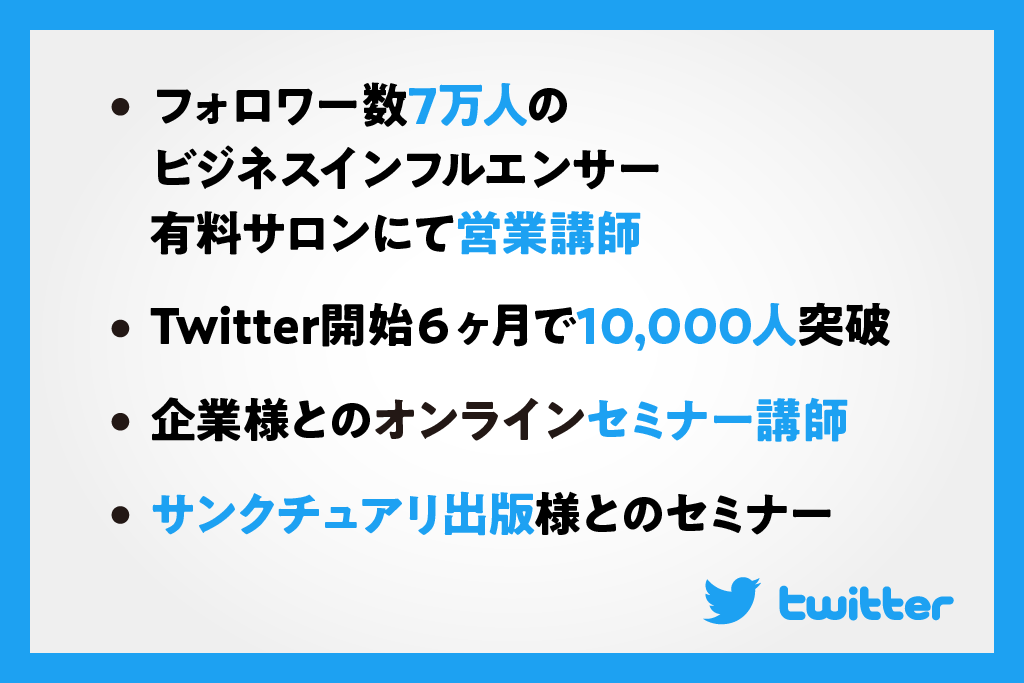 このセミナーではTwitter初心者とネットビジネス素人の私がどうやってビジネスインフルエンサーやたくさんの経営者、成功者の方と関係性を構築できたのかということ、インフルエンサーとどのように交流をしたらいいかというコミュニケーション術を題材にして話していきます。