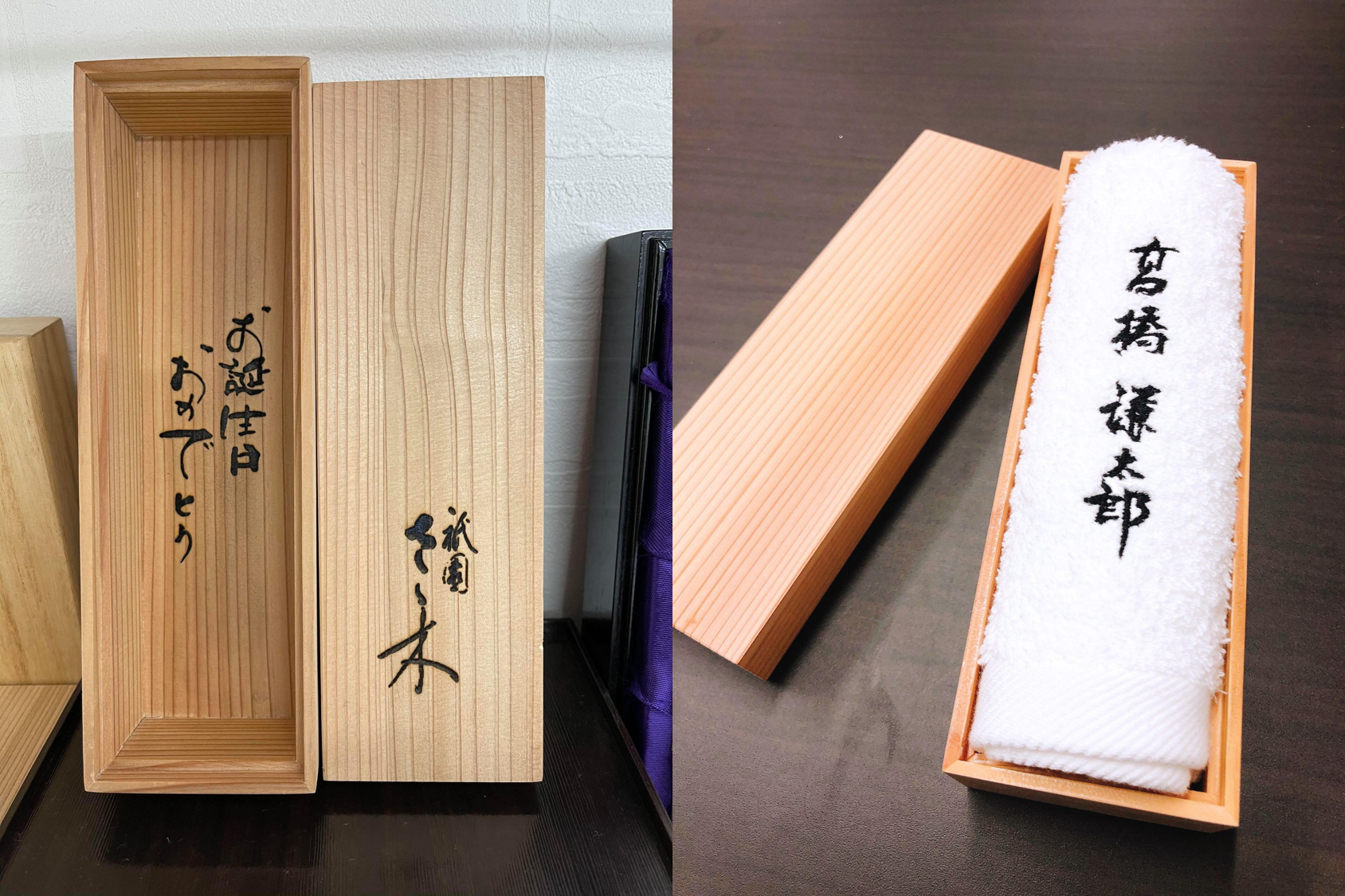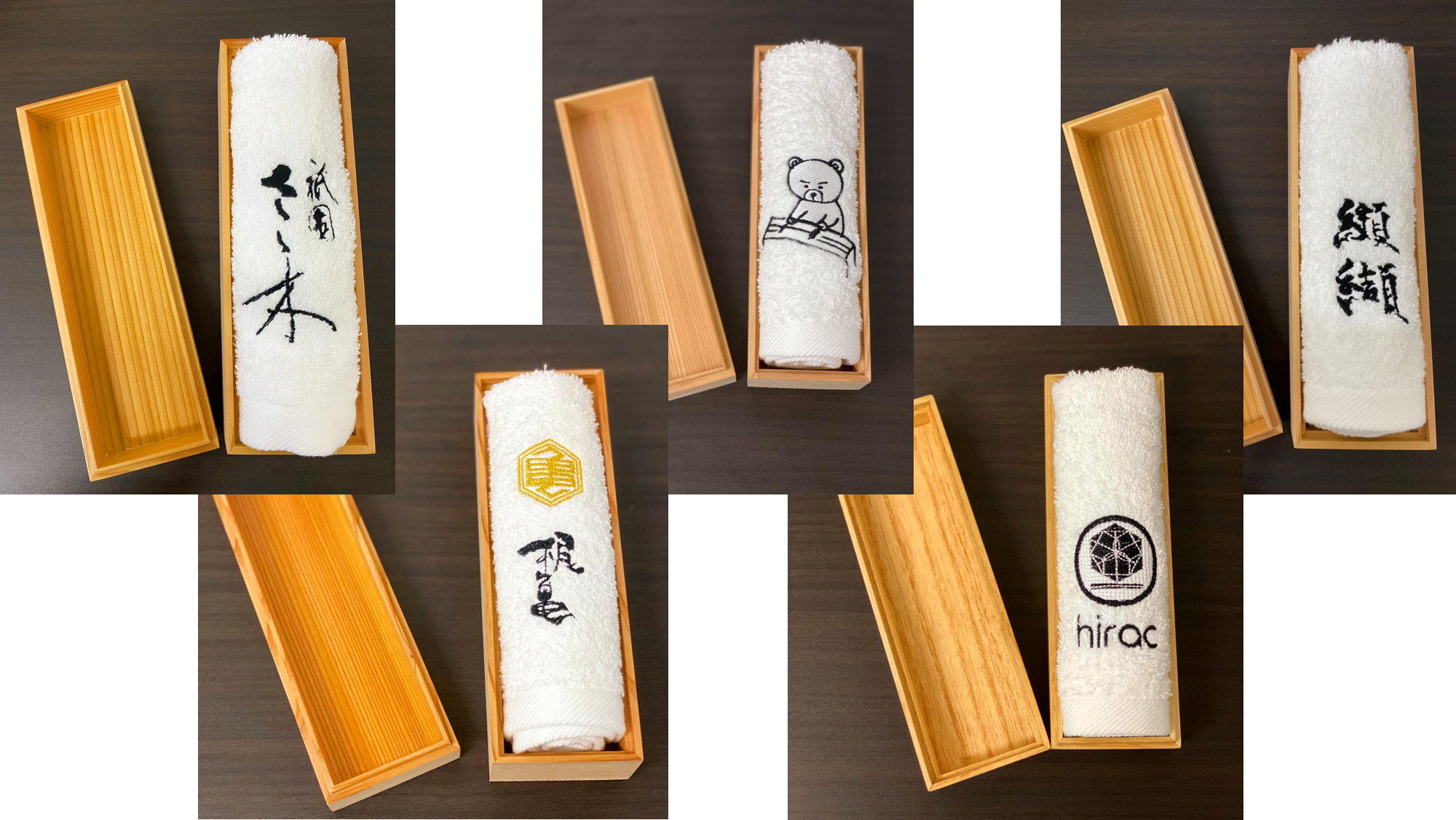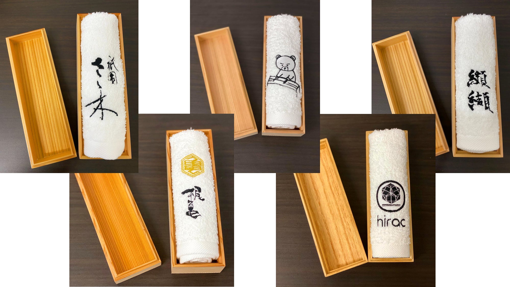 おしぼりを入れる容器に木箱を採用し、写真や文字をプリントするサービスも始めました。箱を開けると刺繍おしぼりが入っていて、それを取り出すと「お誕生日おめでとう」などのメッセージが現れるこのサービスは、贈り物などにも非常に喜ばれています。他にもスワロフスキーで装飾したり、QRコードを印刷したりと様々なサービスを展開しています。
