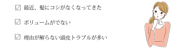 髪は頭皮が変形した組織です。頭皮の毛根で作られるため、頭皮が弱れば髪は知らぬ間に衰え、やがて多くの方が薄毛やボリューム不足に悩むようになるのです。