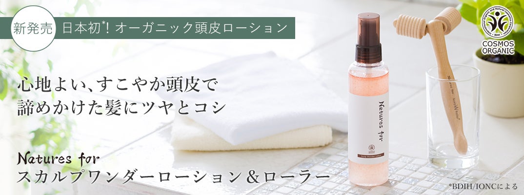 今回ご紹介する新製品”スカルプワンダーローション”と専用ローラーは、頭皮の根本的なしくみに着目し、大学と連携して肌フローラ(肌の常在菌)の研究を行いながら長い年月を掛けて開発してきました。原料は自社有機農場で栽培から取り組み、またたくさんの方にご協力頂きモニター調査を繰り返しながら、高評価を確認した上で、ようやく完成にこぎ着けた、スカルプローションでは、BDIH認証による 日本初の世界基準COSMOSオーガニック認証を取得した環境にも髪にもサスティナブルな製品です。