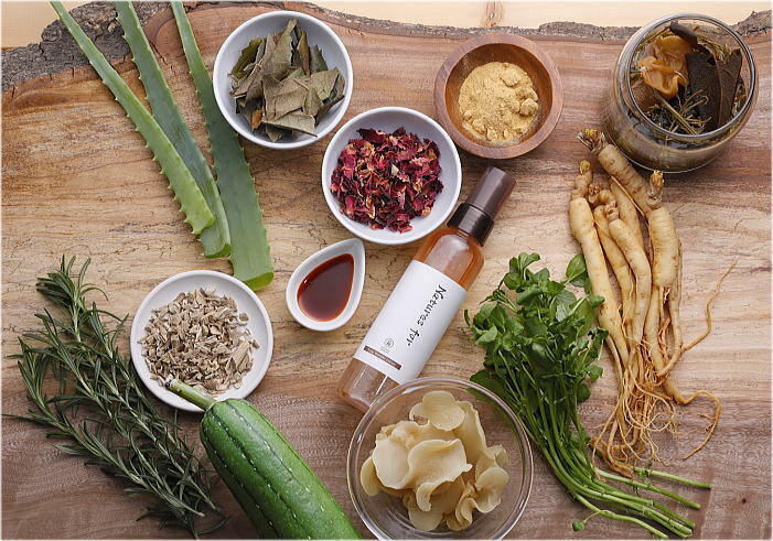 ヘチマ水*、水、アロエベラ液汁*、ヒマシ油*、プロパンジオール、スクワラン、ビワ葉エキス*、オタネニンジン根エキス、センブリエキス、オランダガラシ葉/茎エキス、ムラサキ根エキス*、ヒポファエラムノイデス果実油*、シロキクラゲ子実体エキス*、ローズマリー葉水*、ヒマワリ種子油*、キサンタンガム、グリセリン*、セイヨウシロヤナギ樹皮エキス、ハッカ葉油、ニオイテンジクアオイ油、ニュウコウジュ油、レウコノストック/ダイコン根発酵液、エタノール*