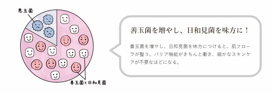 この常在菌たちは、「善玉菌」「悪玉菌」「日和見(ひよりみ)菌」の3種類に分けられます。肌にとって有益な働きをするのが「善玉菌」、有害な働きをするのが「悪玉菌」、状況によって有益にも有害にもなるのが「日和見菌」です。