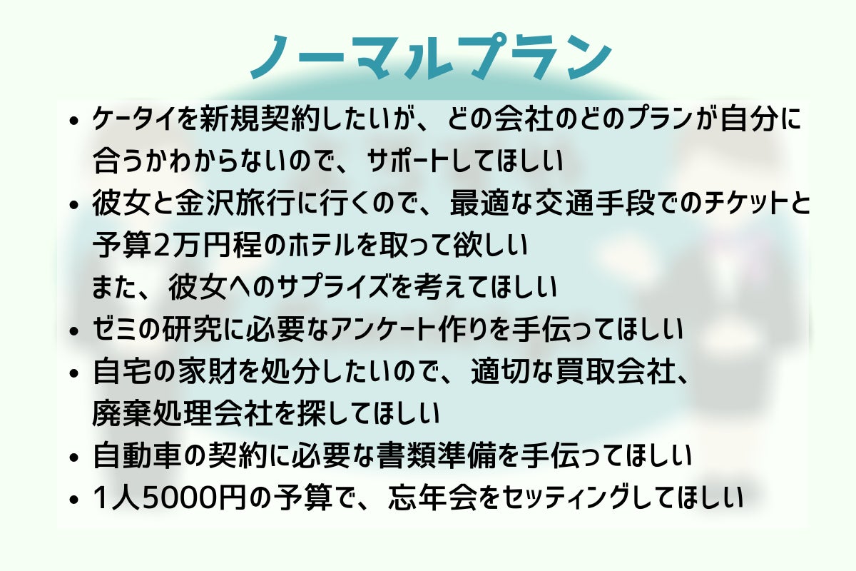 飲み会のセッティング、旅行の段取り(旅館、レンタカーの手配、サプライズ演出の企画・準備など)、ケータイ電話の契約や自動車の購入時などに必要な煩わしい手続きと書類作成お手伝い、留学や海外出張に必要な英語での書類作成のサポートなど、幅広い分野のお手伝いを手軽に頼める月額制のコンシェルジュサービスです。