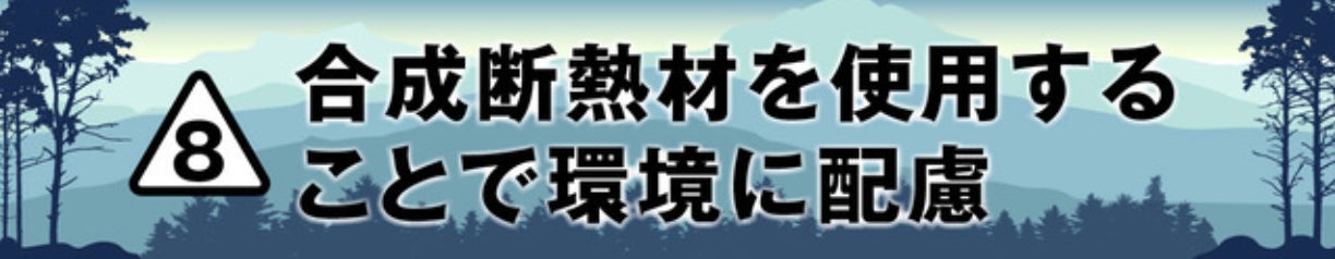 こちらは、軽量で熱効率の高い連続フィラメント断熱材。夜露に濡れた場合や、汗などのこもった湿気も驚くほど早く乾く特長を持ちます。