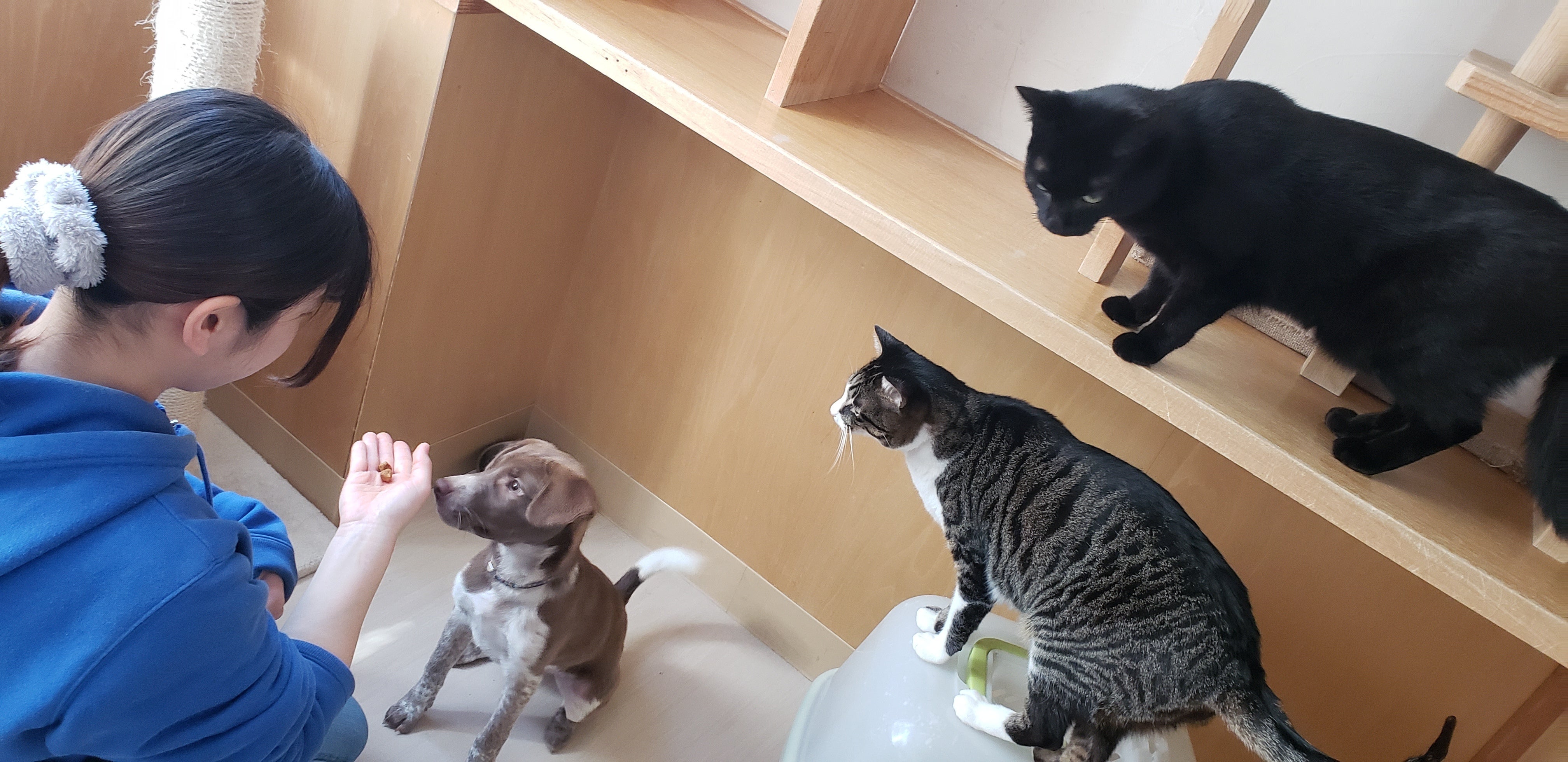 保護犬と猫 お互いの存在になれる社会化トレーニングの様子