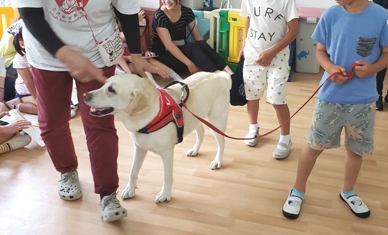 ドクタードッグたちは、安心安全に子ども達がふれあいできるよう、「いのちの授業」や啓発活動にも参加してくださっています。