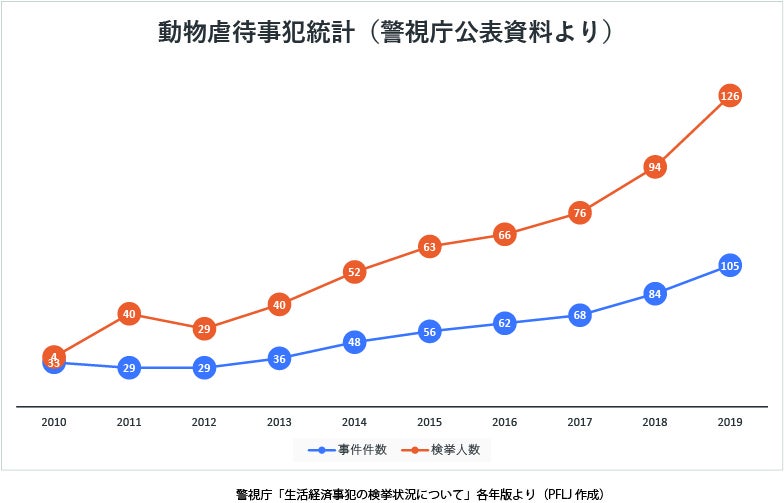 そして、残念なことに全国の警察が昨年2019年に摘発(逮捕・書類送検)した、動物を虐待したとする動物愛護法違反容疑の件数は前年より21件多い105件、検挙人数126人と統計がある2010年以降で最多であり、動物を捨てる遺棄が最も多く、その他、餌を与えず不衛生な環境での飼育や殺傷する行為もみられました。