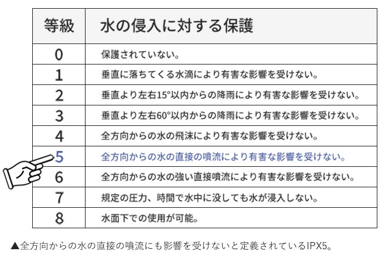 A:いいえ。IPX5の防水性能を有しておりますので、全方向からの水の噴射から保護されますが、水に浸けることは故障の原因となりますのでおやめください。