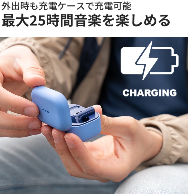 イヤホンケースは充電ケースにもなっており、約3.5回、左右イヤホンをフル充電にすることが可能です。フル充電にかかる時間は約1.5時間。合計25時間、電源環境の無い環境でも音楽を楽しむことができるのは、うれしいですね。
