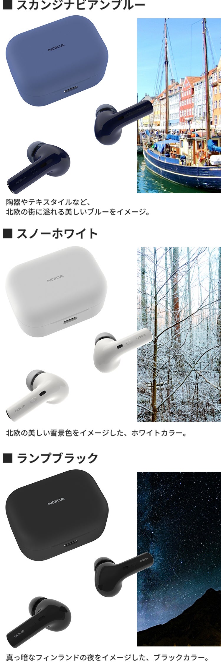 フィンランドメーカーNOKIAならではの、洗練された北欧デザインも本製品の魅力。流線形のフォルムの美しさが際立つシンプルなデザインと、ホワイト・ブラック・ブルー、3色の北欧カラーが美しい逸品です。