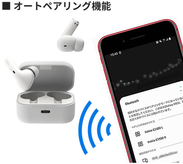 「NOKIA E3500」なら、そんな心配もご無用です!初回ご使用時に、スマホとイヤホンのペアリング作業を行っておけば、次回からはケースからイヤホンを取り出すだけで、自動でペアリングが行われます。その間、わずか2秒!すぐに音楽が聴ける状態になります。