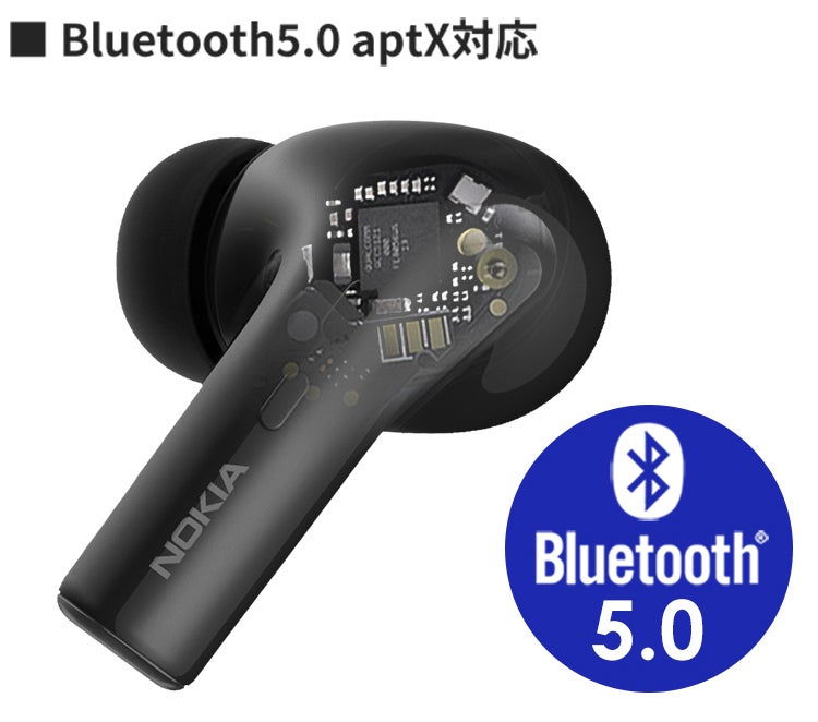 「NOKIA E3500」は安定したデータ転送を実現する、Bluetooth5.0を搭載。遅延のストレスを大幅に軽減します。さらに、高音質コーデック、aptX対応。データの圧縮率が少なく、従来の標準コーデックと比べ、よりクリアな音を楽しむことができます。