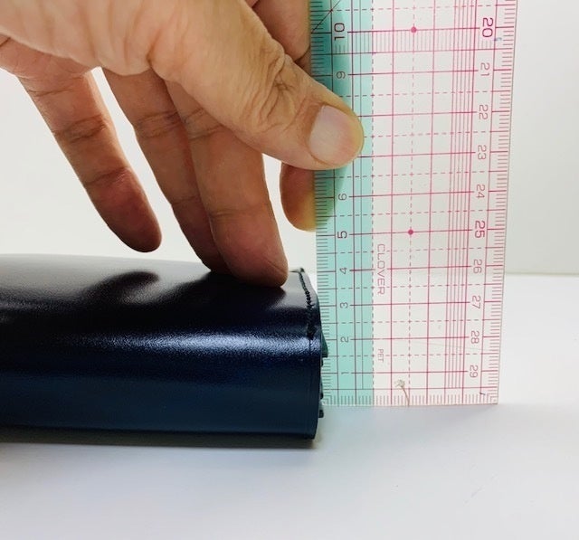 長財布の容量に負けない収納力を生み出すため、表革・内装用革を合わせて約24デシを使用しております(10×10cmの革が24枚)。内装に使用する革の厚みを耐久性限界まで薄くすることで、ミドルウォレットでも収納力をアップさせることが可能に。革と革の合わせ部分(すき間)を有効活用することで、この大容量が可能になりました。