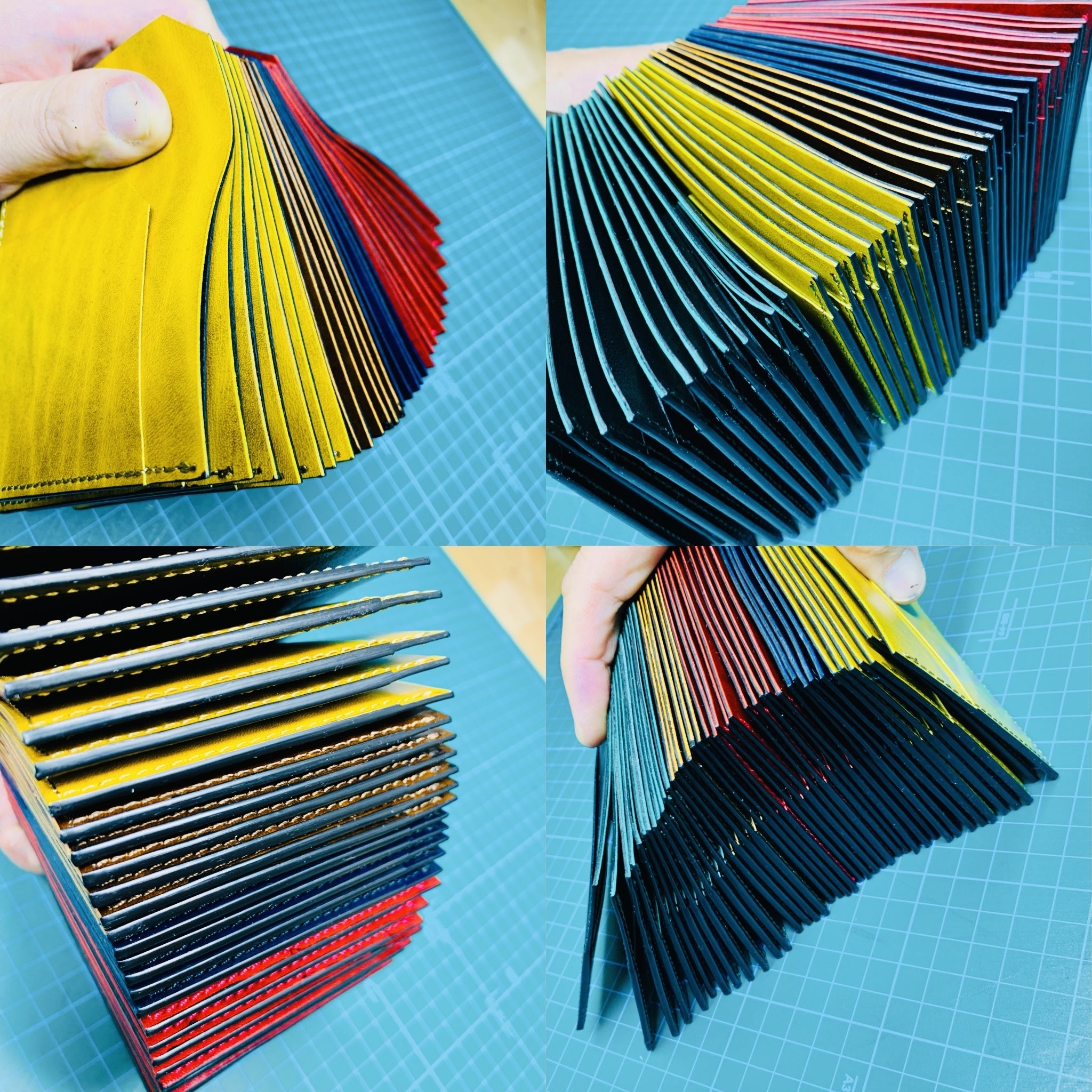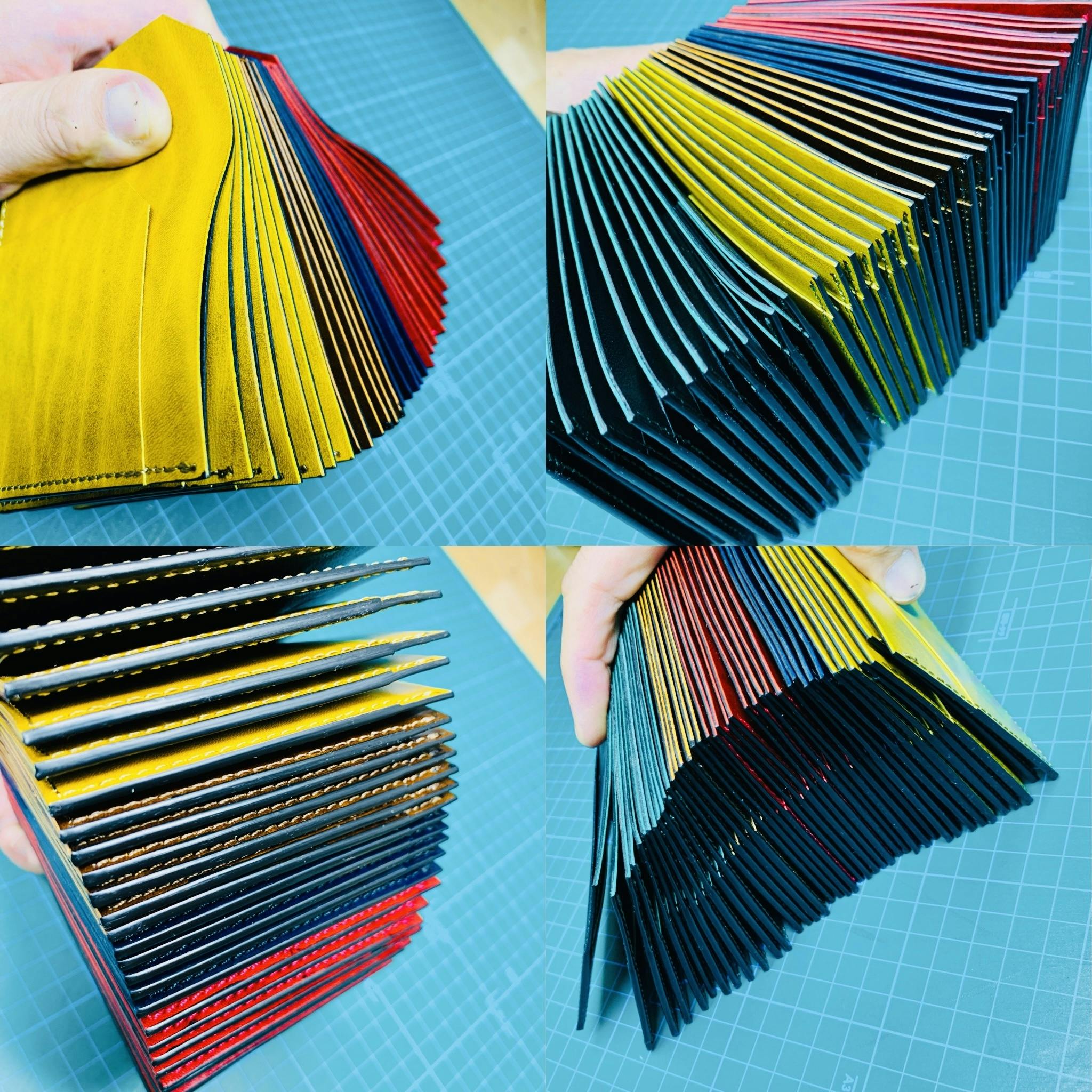 イメージしている理想のお財布を作り上げる為に、幾度となく表の革・内装に使用する革を選定。今回使用する「ベルギー産ルガトーショルダー」と「㈱三昌の姫路レザー」にたどり着きました。
