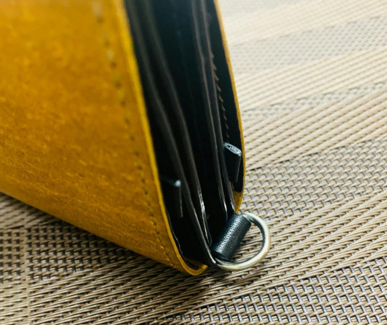 ストラップにはナスカンが付いており、お好みのストラップを取り付け可能です。Dカンを使わないときは、折り返してお財布本体に押し込められます。