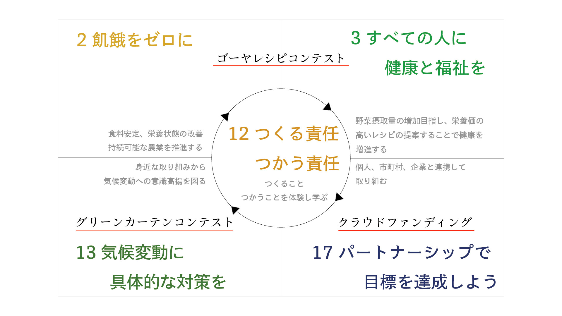 私たちの未来をより良くするために、SDGsに多くの人を巻き込んで取り組みたい!SDGs(持続可能な開発目標)とは2030年の、私たちの未来をより良くするための目標(Goals)ということで、17の目標が設定されています。最初はあまりにも漠然としていて、しっくりこなかったのが正直な感想です。しかし、身近なことから始めることが大切と知り、私たちが研究している「ゴーヤ」を活用できないかと考えました。地域の課題を考え、ゴーヤの「グリーンカーテンコンテスト」「レシピコンテスト」を開催することを決めました。この2つのコンテストは多くの人がSDGsへ取り組む最初のステップになると思います。