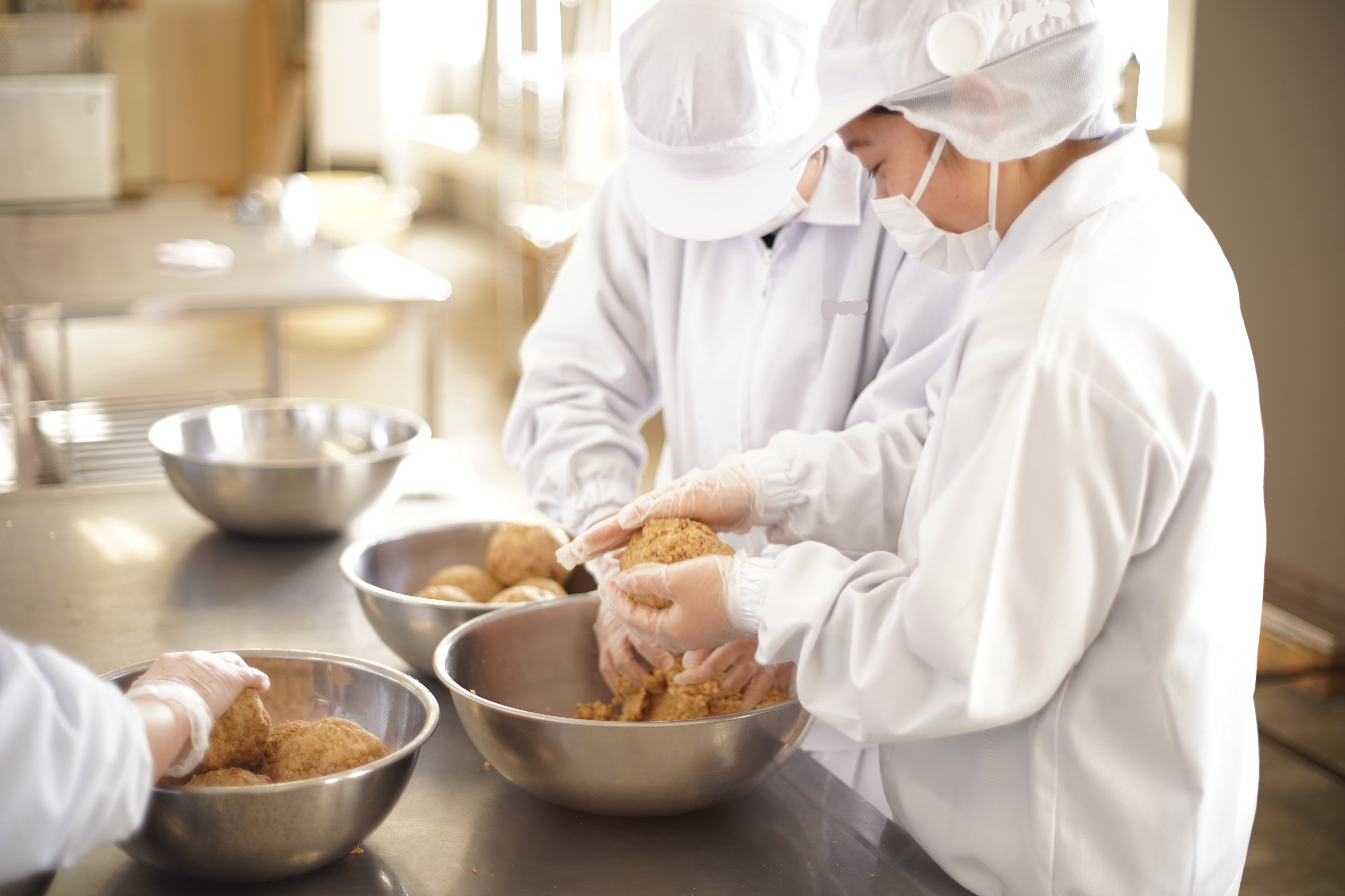ミンチ状になった大豆と麹でソフトボールくらいの味噌玉を作ります。その味噌玉を空気が入らないように容器に詰めていきます。表面に塩を振り、あとは発酵と熟成を待ちます。