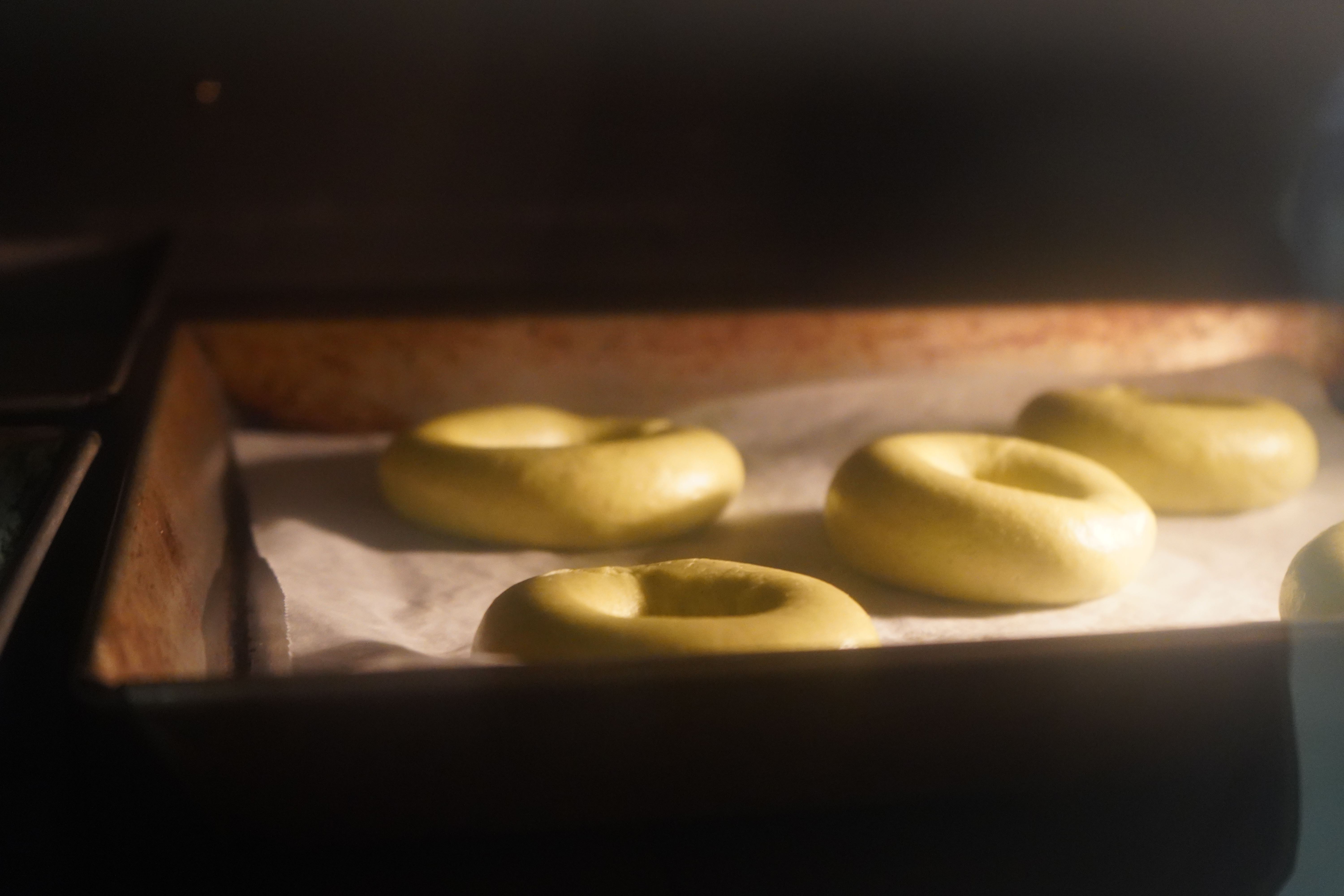 商品開発の一環として、ゴーヤのベーグルを試作しました。材料を混ぜ、10分~15分程度、全体がまとまるまで捏ねます。発酵機で10分休ませたあと、1つ70gに切ります。濡れた布をかぶせてさらに10分休ませます。ベーグル型に成形し、30分から40分発酵させます。きび砂糖を入れたお湯(70℃~80℃)で両面30秒程度、ゆでます。180℃で20分焼いて完成です。