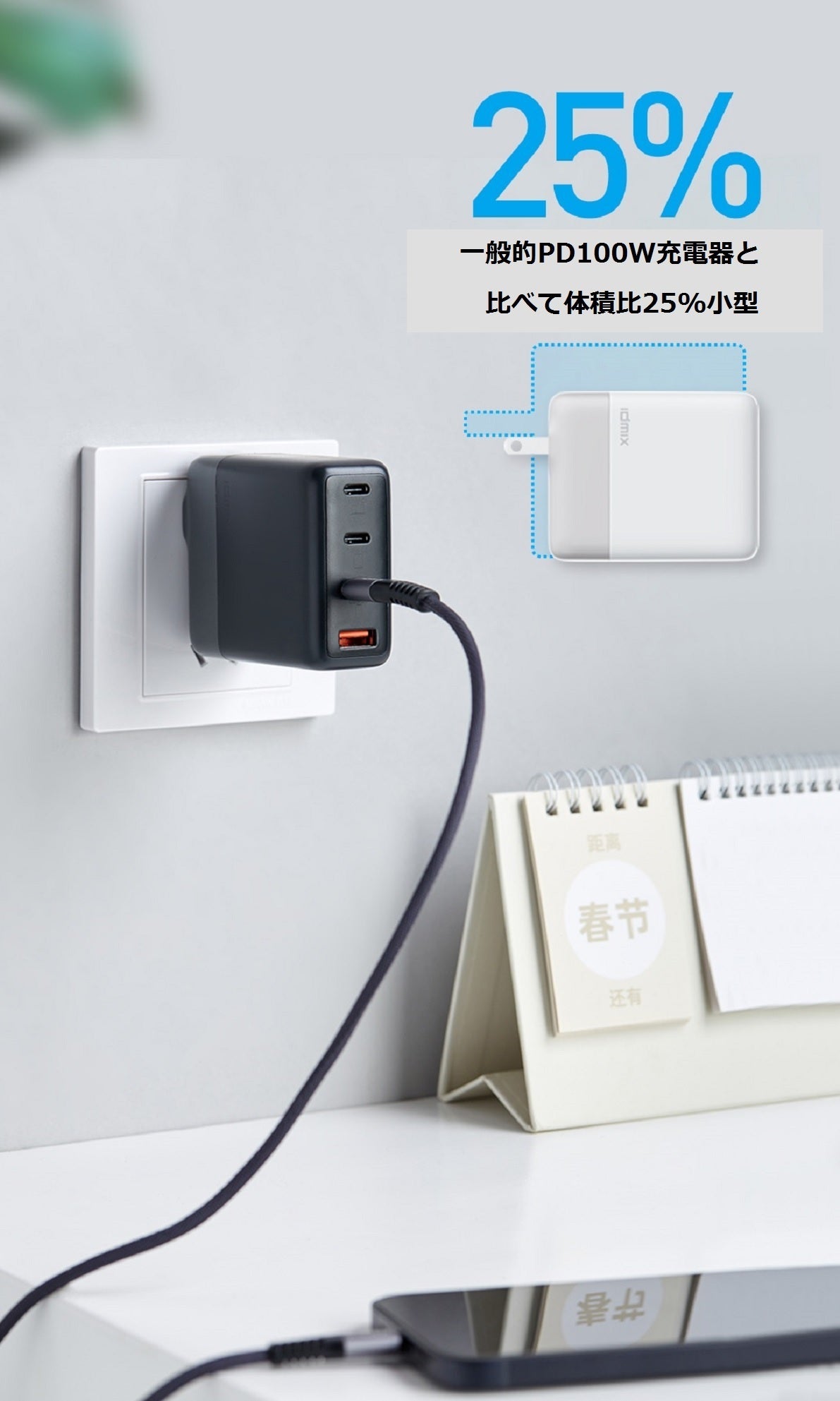 POWER CUBE P100は最新技術 GaN(窒化ガリウム)搭載充電器です。高出力をキープしながら、小型化を実現しています。一般的な従来PD100W充電器に比べ体積比25%の小型化を実現しています。