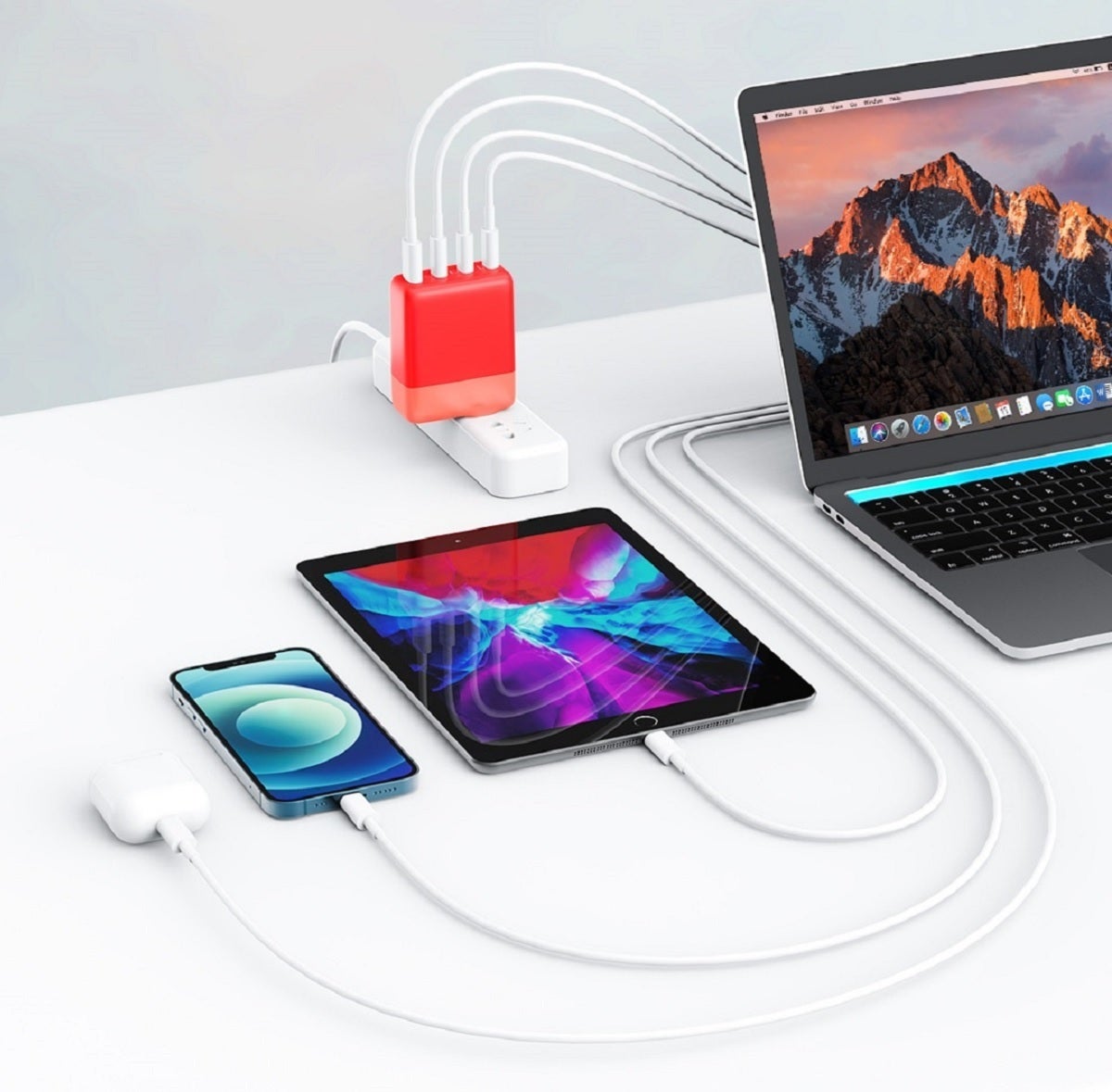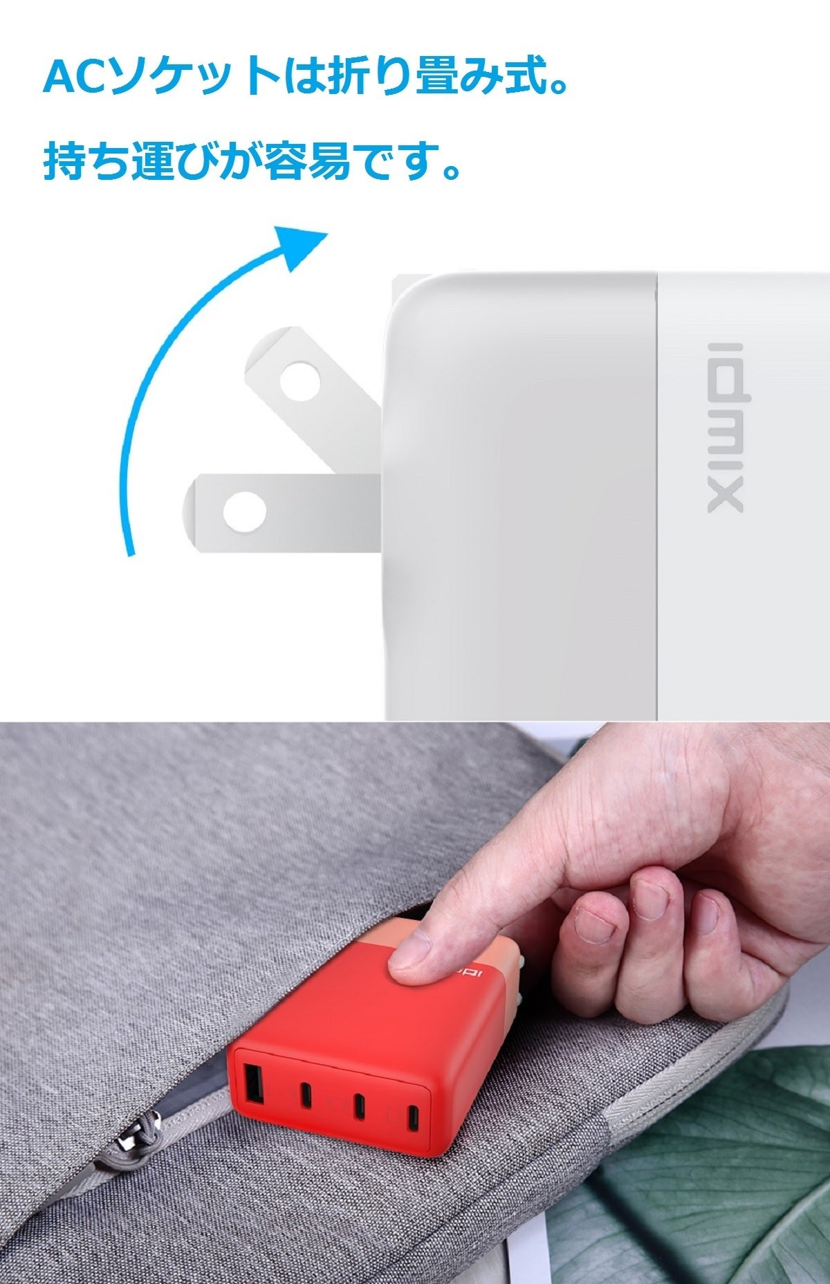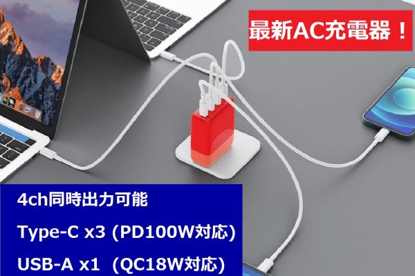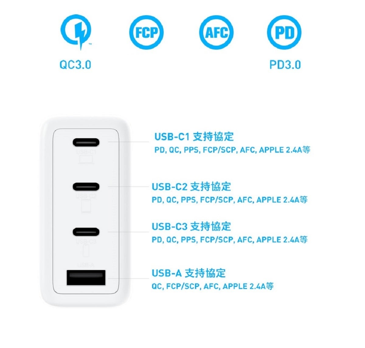 Type-C出力3つ、USB-A出力1つ、計4つの出力を持ち、4台のデバイスを同時に充電できます。