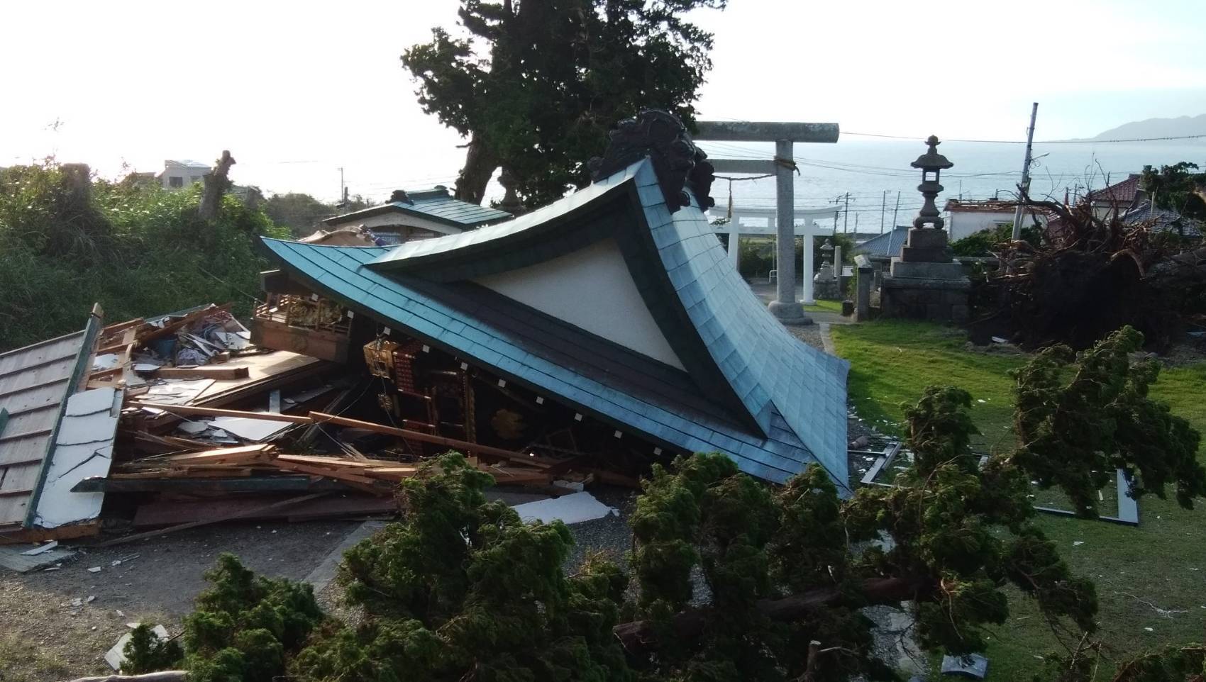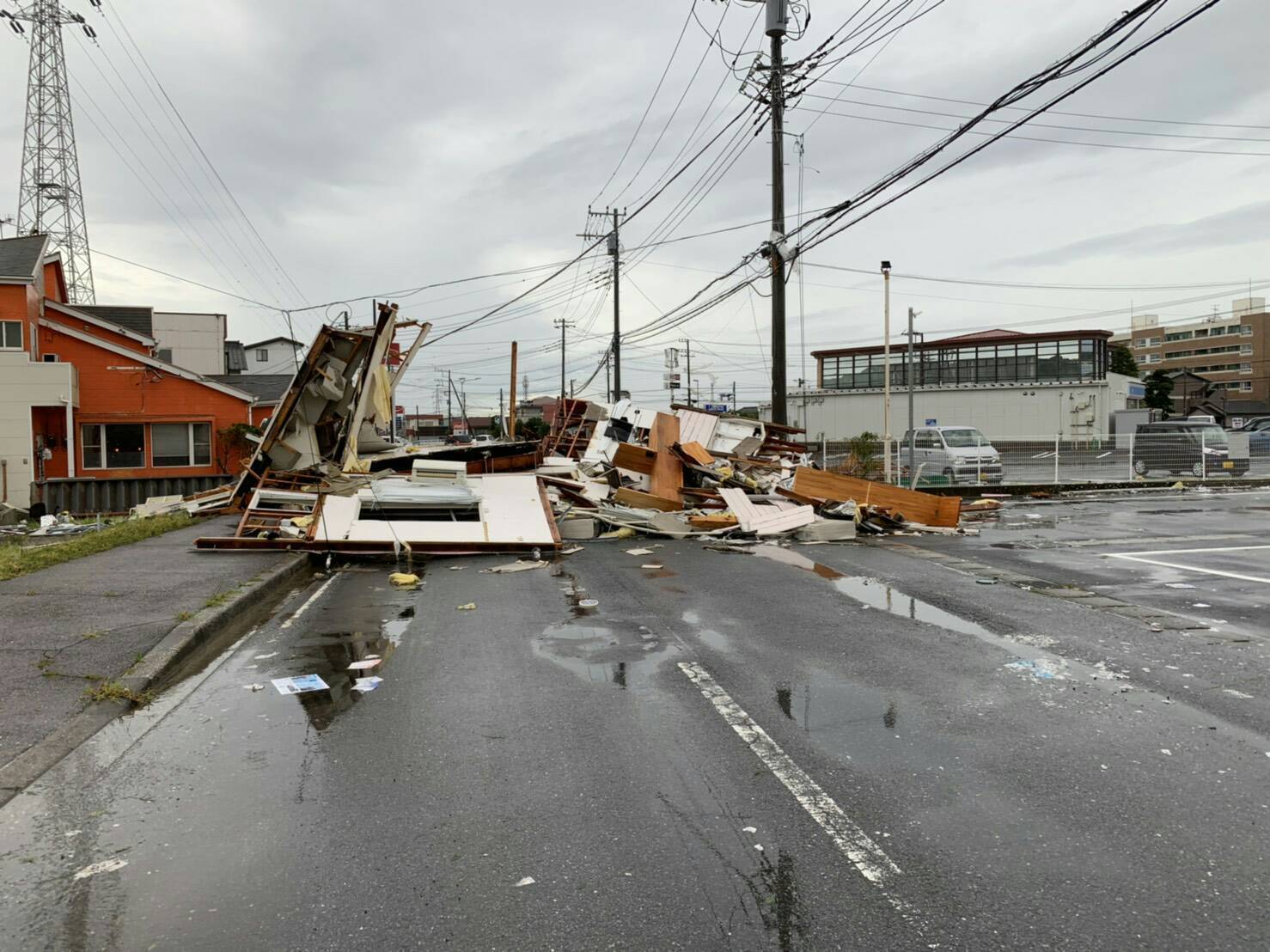 近所の家、見慣れた街並みがメチャクチャになっていました。そこら中、屋根瓦が吹っ飛んでブルーシートをかけている家だらけで、日が沈むと街は完全な闇に覆われてしまいました。暴風でガラスが破れて営業再開できなくなっている商店や、ついてない信号、根元から折れ曲がった電柱。