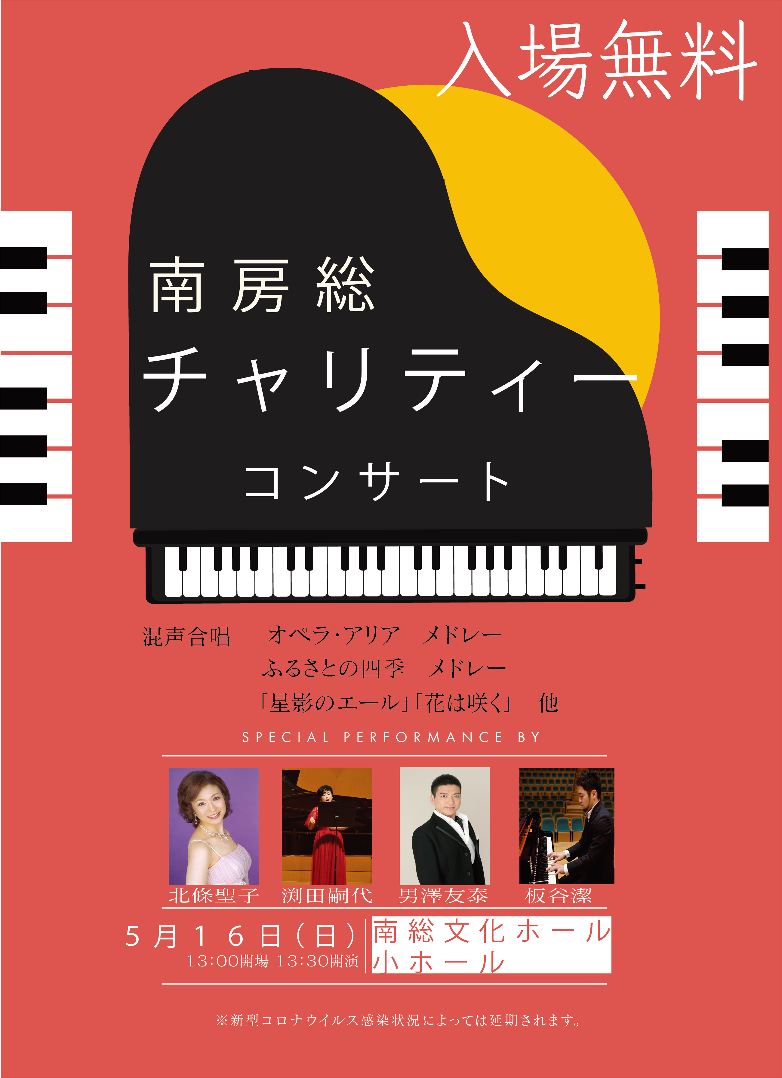 千葉県館山市の南総文化ホール小ホールで、入場無料のチャリティーコンサートを開きます。