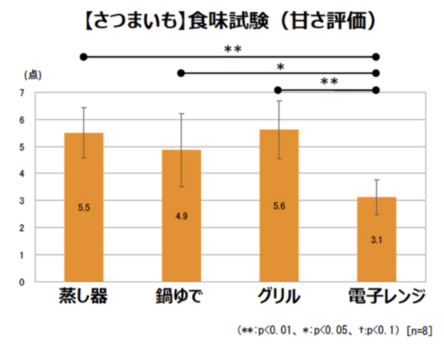 実際に、さつまいも調理後の甘さを比較したところ、「蒸し器」で調理したさつまいもは甘いと評価されています。