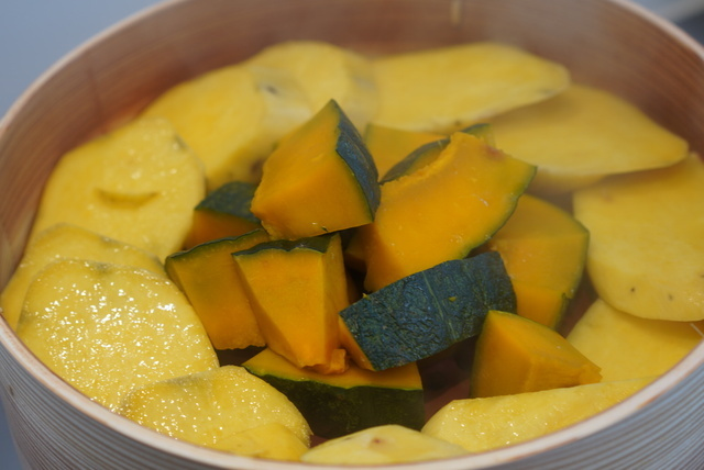 大きなセイロでたくさんの野菜を蒸し上げて料理の下ごしらえの効率化UP
