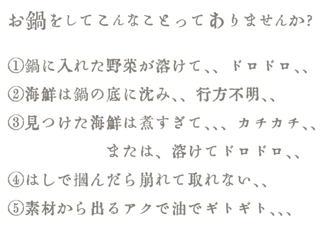 また、素材の旨味は溶け、鍋に旨味が流れてしまいます、、