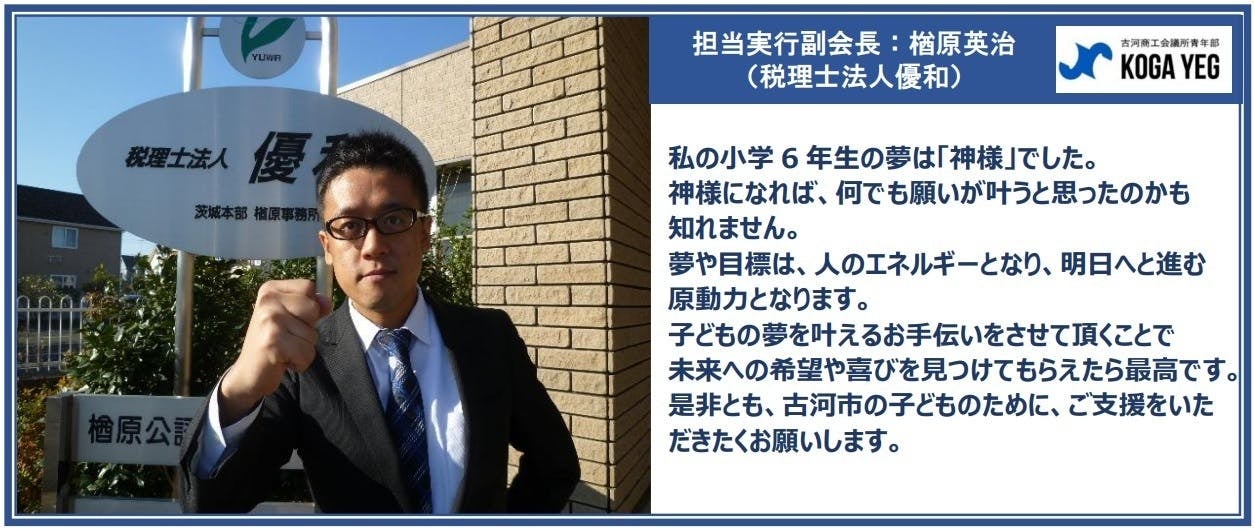 この企画が子どもたちの夢を実現する第一歩となることを、そして、こうした活動を紡ぎ続けていき、古河市を夢の追い求められる地域にしていくことを、夢見ています。