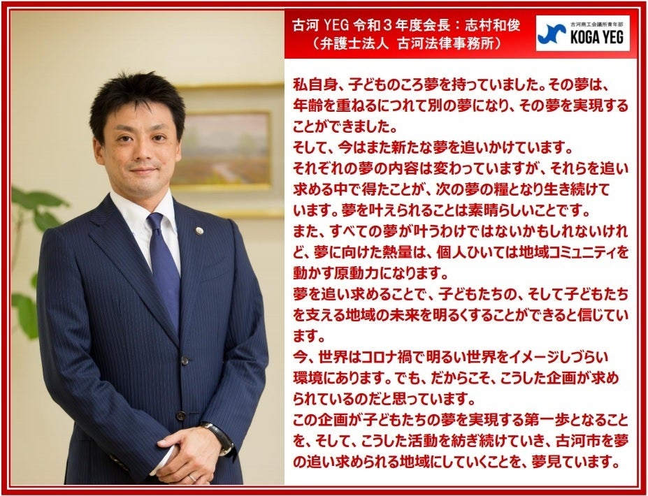 子どもたちに自身の夢を想像してもらい、叶えるために行動し、そして何より夢を叶える達成感を知ってもらいたい。古河YEGが全力で夢の実現をサポートします。