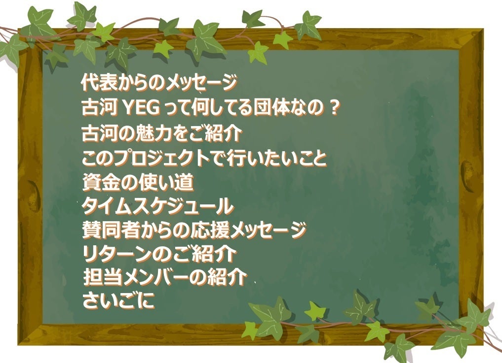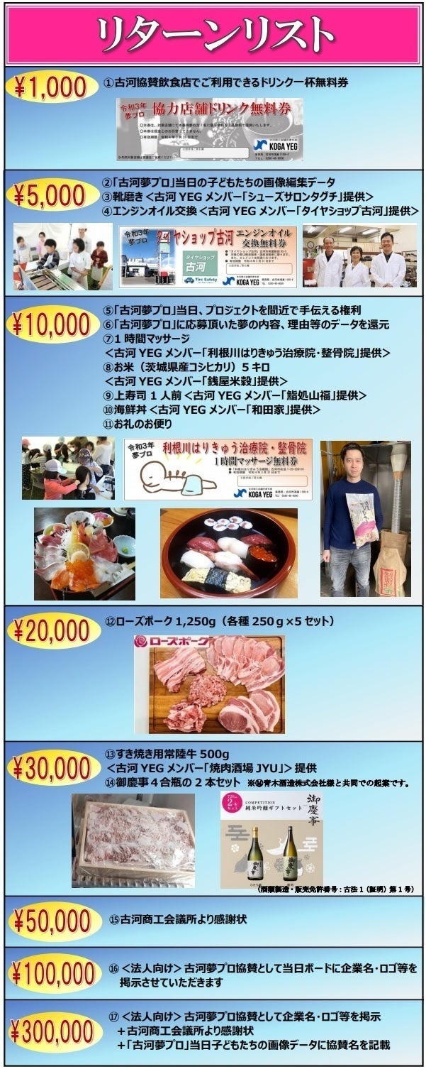 リターンは後段で紹介させて頂きますが、古河YEGメンバーが本プロジェクトへの想いを込め、対応をしています。