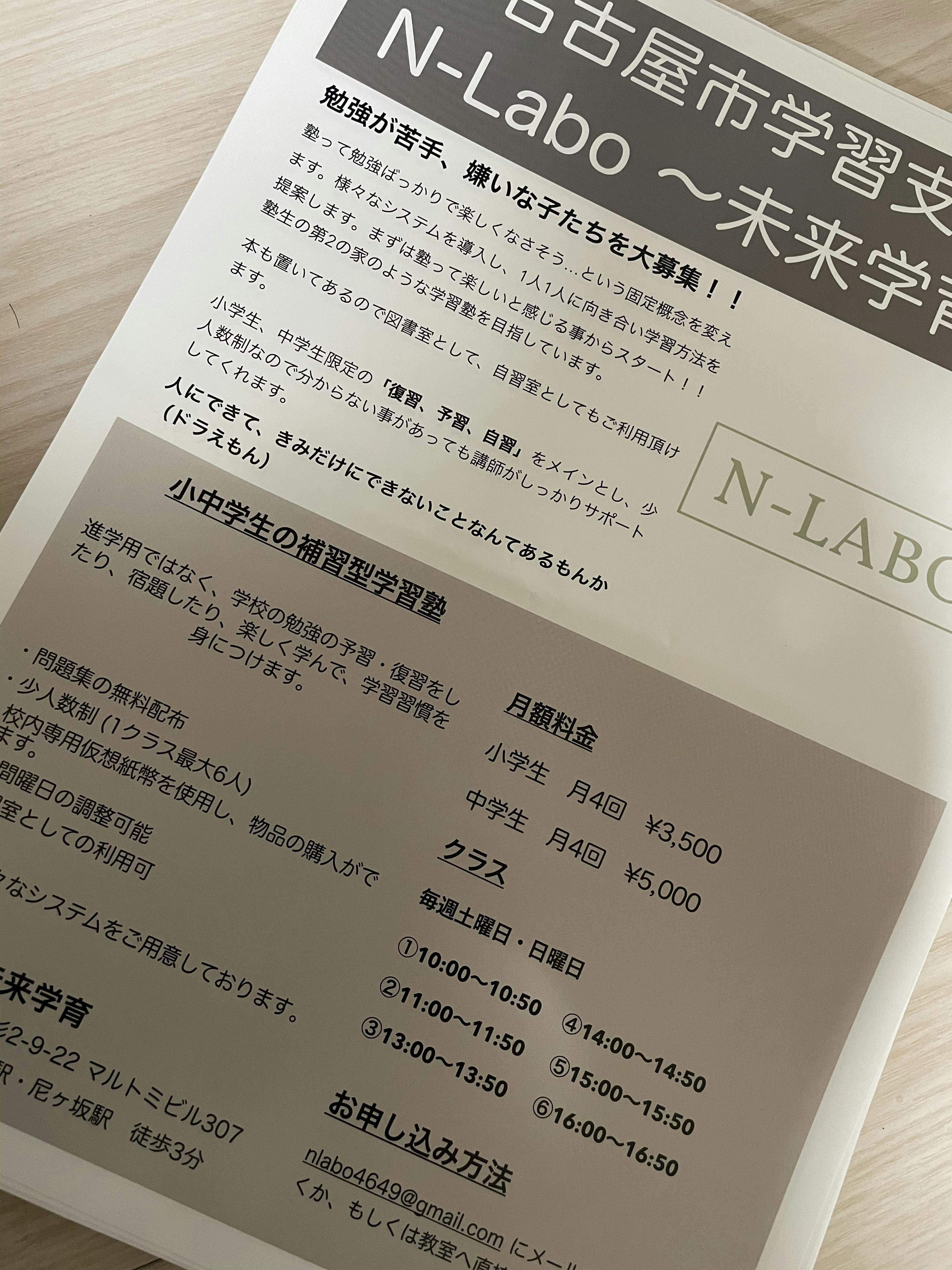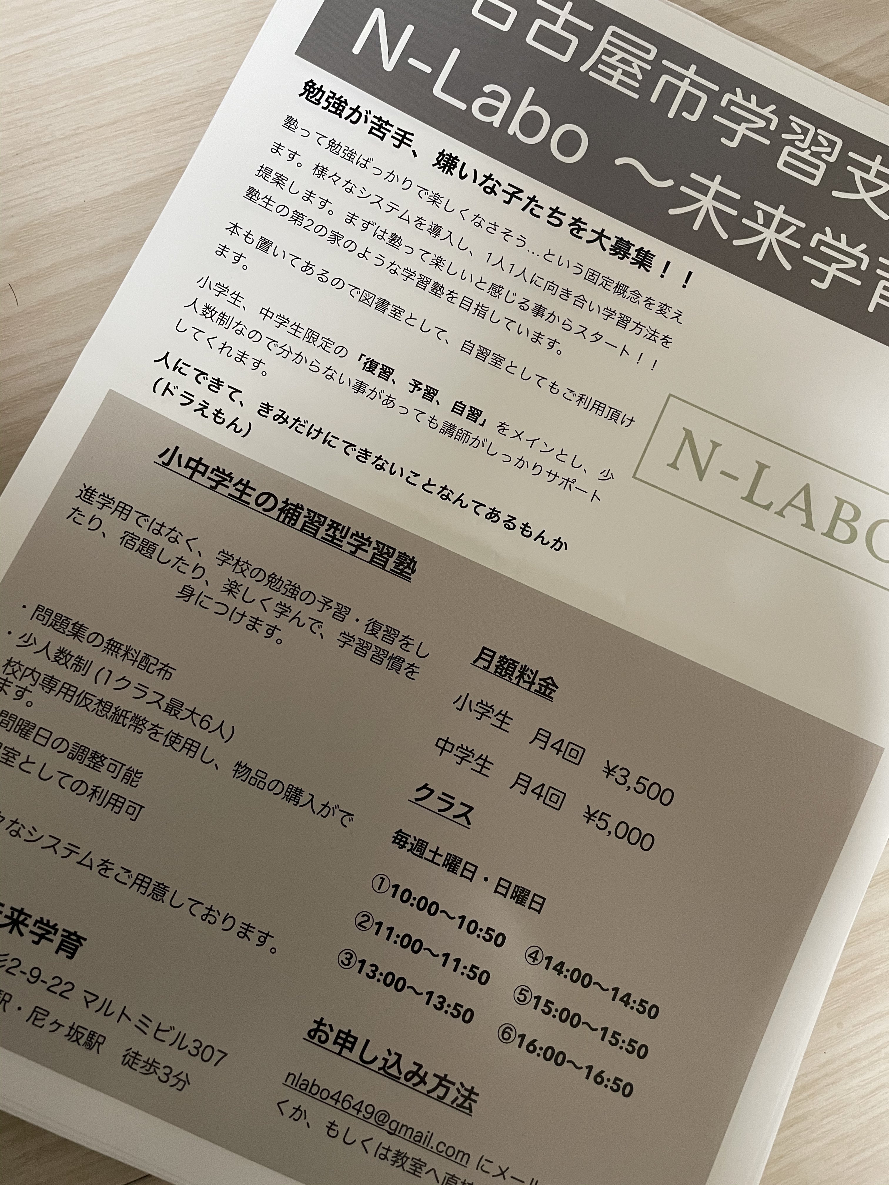 小学生月4回¥3000、中学生月4回¥5000で、曜日時間帯は様々な家庭の都合に合わせれるようにしました。問題集は無料提供で、教科書代も一冊一律¥1000です。