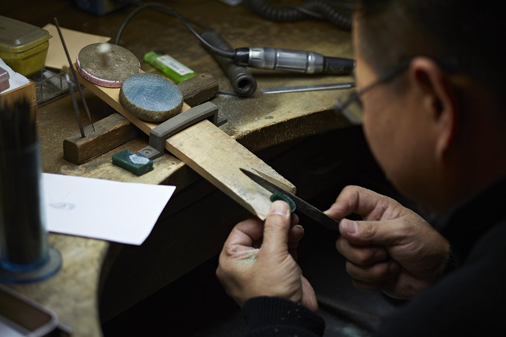 2人目の職人は、ジュエリーの組み立てや仕上げの工程を行う職人です。弊社のジュエリー原型は複数のパーツに分かれて製作される事が多くあります。なぜかというと、複数のパーツに分けることで、通常であれば工具が入らない細部まで手を加えることが出来るからです。彼はジュエリーの工具以外に身の回りにあるような様々な素材を使用して完璧な仕上げを実現させます。一方で、複数に分けることでロウ付けと言われる組み立ての工程が加えられます。ロウ付けは高温の火を使用しますが、このロウ付けの出来もジュエリーの完成度に大きく影響します。仕上げ磨きの技術、酸化させないロウ付けの特殊な技術によって完成度の高いジュエリーが仕立てられます。