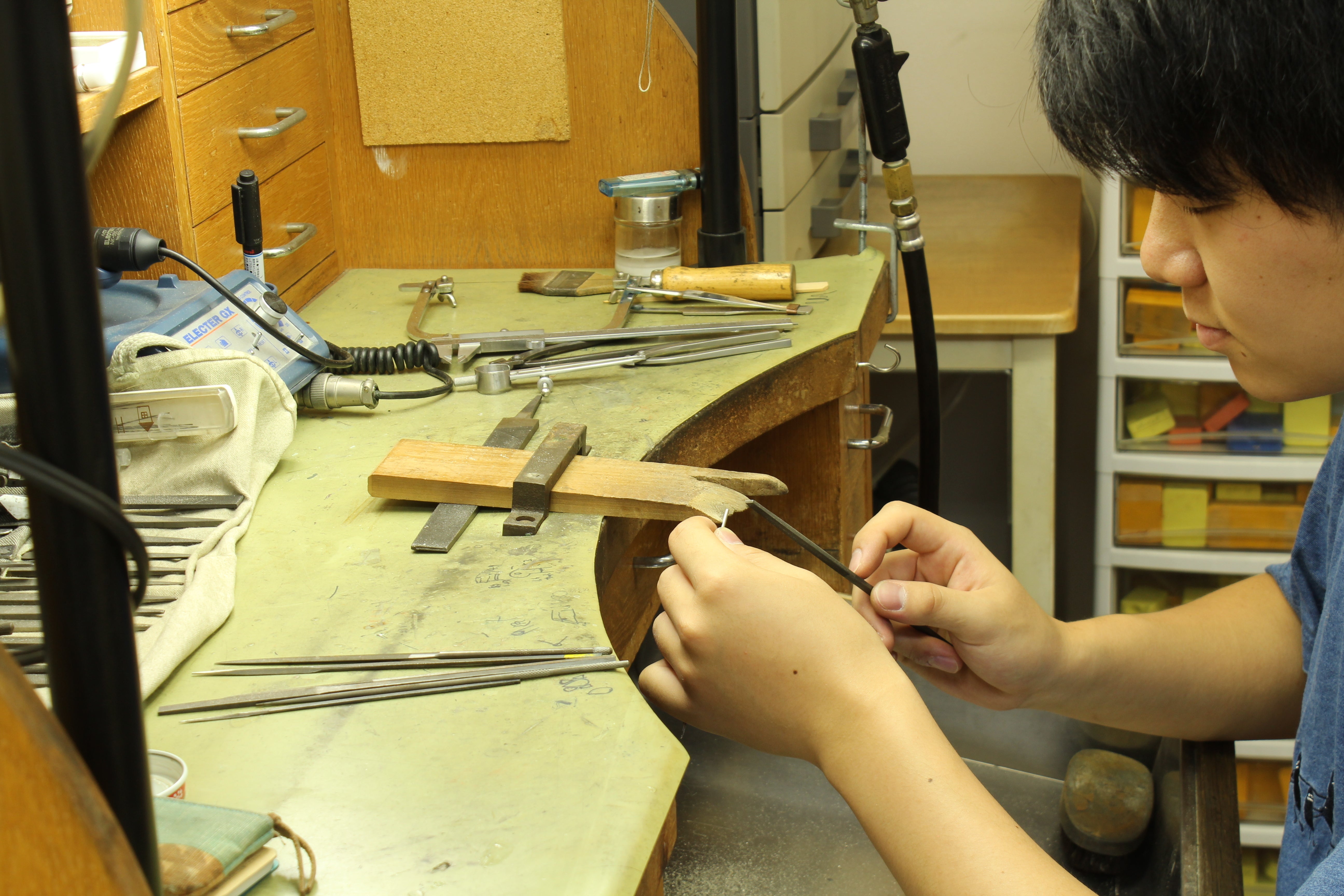1人目の原型職人は、技能五輪全国大会で金メダル、技能五輪国際大会で入賞をした実績を持ち、大手ブランドのOEM等を数多く手掛けた後に独立。弊社ブランドの新作を中心に製作の日々を送っています。彼は、平面のデザイン画を見ると、完成形が立体で頭の中に投影されると言います。製作するジュエリーに合わせて必要な工具から自作し、平面から立体に起こしていきます。同じデザイン画でも、手掛ける職人によって完成形は違ってきます。その意味において、彼の製作するジュエリーの完成度の高さは群を抜いています。