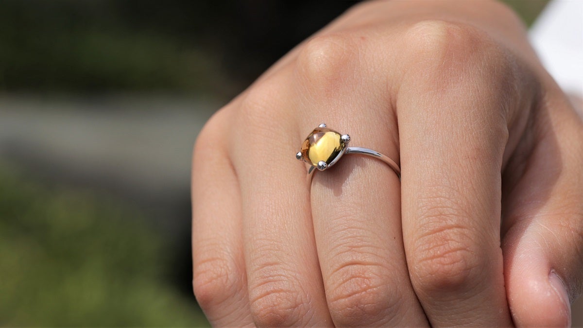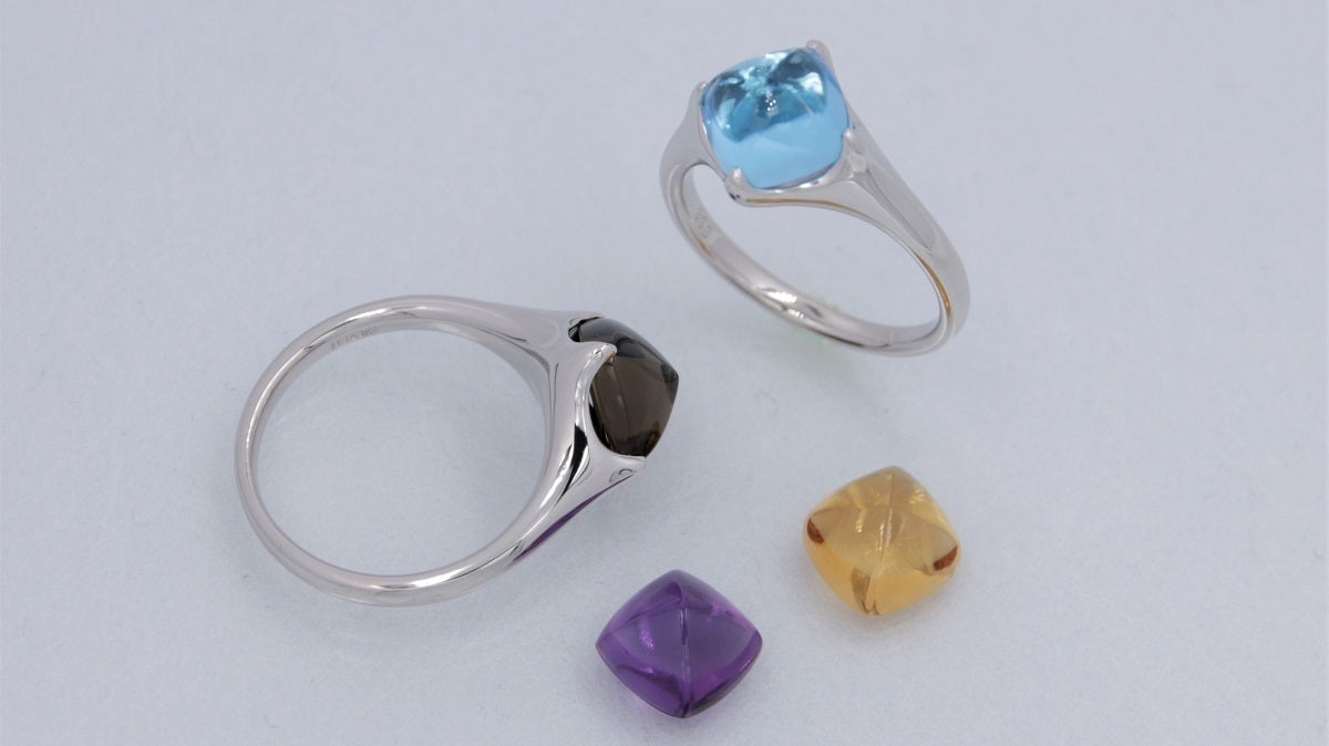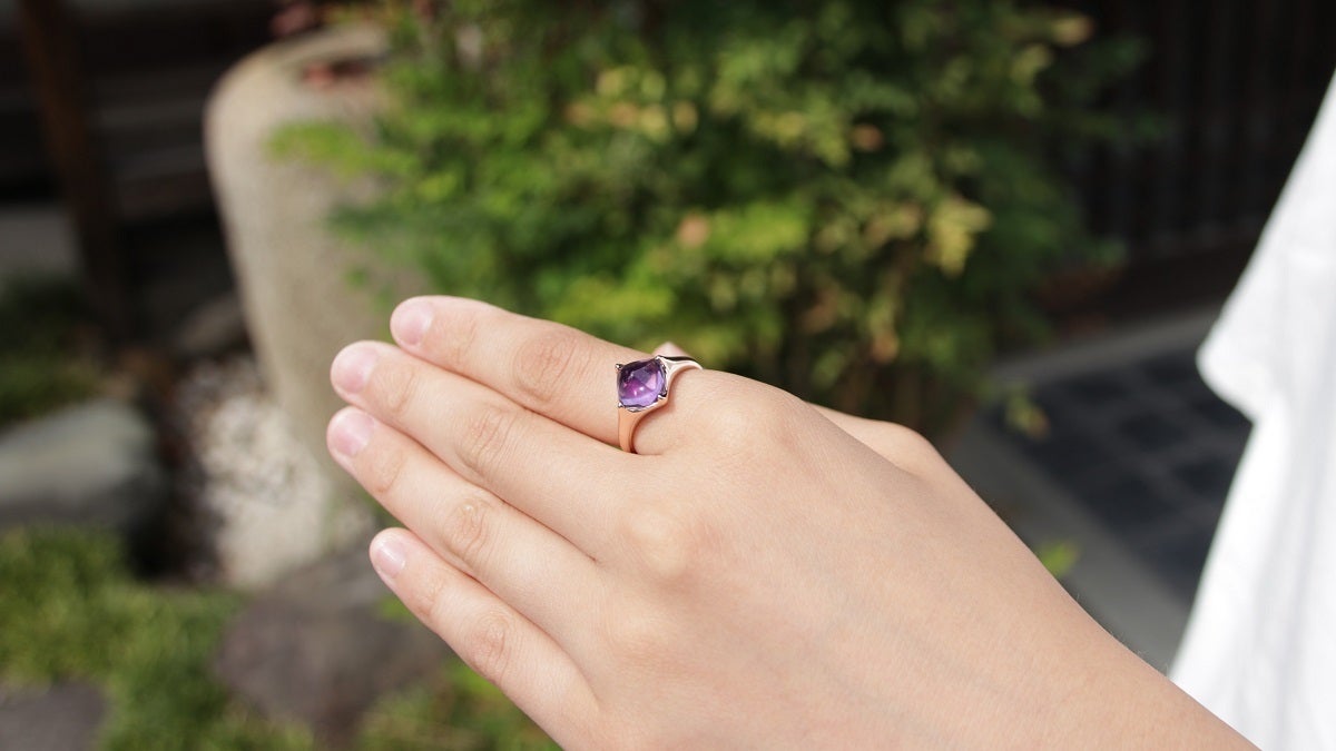 天然石の裏側にある面は、鏡のようにきれいに仕上げております。その他、全体的なフォルムや輝き、右下のマットな仕上げも一つひとつの作業を丁寧に行う職人の技術により生み出されます。ここまできれいに仕上げることができるのも高品質なジュエリーを手掛けてきた職人のこだわりと、本当にいいものを身につけてもらいたいという想いがあるからです。