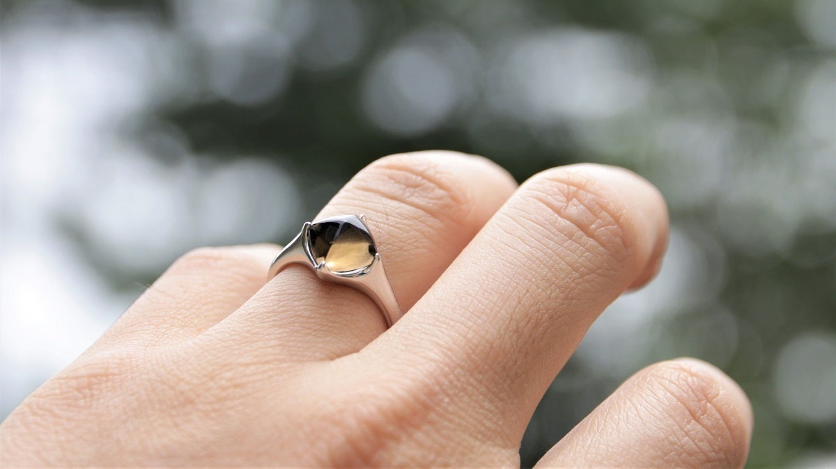 地金をしっかりと使い、職人の手仕事によってきれいに磨かれたリングです。この存在感は、男性でも女性でも身に纏えるシグネット調のリングです。