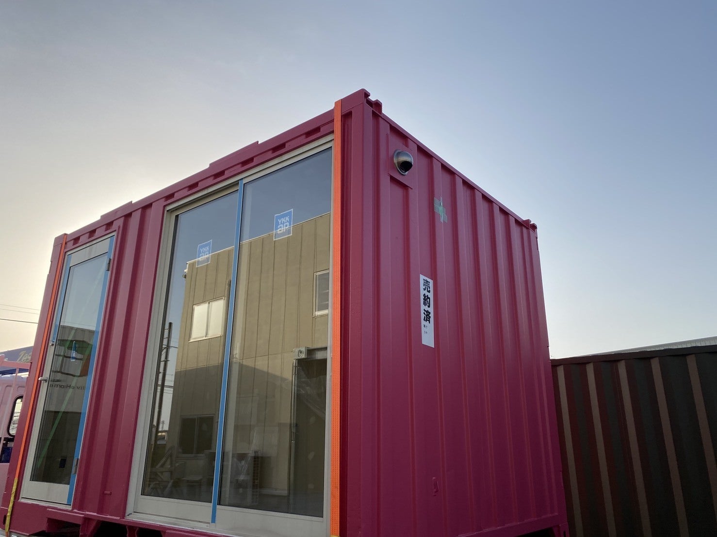 今、コンテナは施工会社さんの資材置き場にあるので、当然、「景色」はその周りの建物になっています。