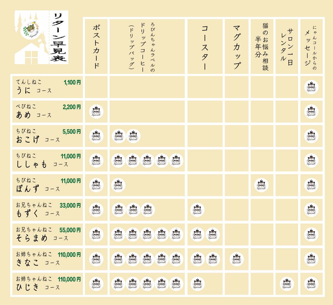 コースによって、特典内容の組み合わせや個数が異なりますので、早見表を参考にご確認ください。